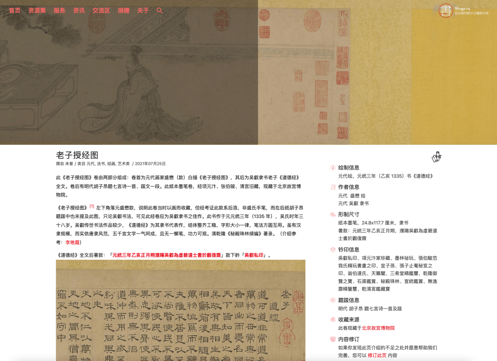 The website also allows for the digital reunion of scattered sets of paintings. For example, the set of eleven hangings scrolls of The Sixteen Arhats (十六羅漢圖), which now exists in two Japanese collections in Tokyo and Gunma Prefecture, are presented as a single entry. Although Shuge’s entries on paintings are not as numerous as its “traditional books,” many of the website’s entries on handscroll paintings also provide transcriptions of colophons and seals, which offer indispensable information about the social history of the works. For example, in the entry on the fourteenth-century handscroll Laozi Conferring the Daodejing (老子授經圖), the website provides transcriptions of the sixteen collector seals on the painting. In this entry, the website also includes reference to premodern collection records related to the painting, such as the Pearl Forest of the Secret Hall (秘殿珠林續篇), a record of Buddhist and Daoist paintings in the imperial collection during the eighteenth century.