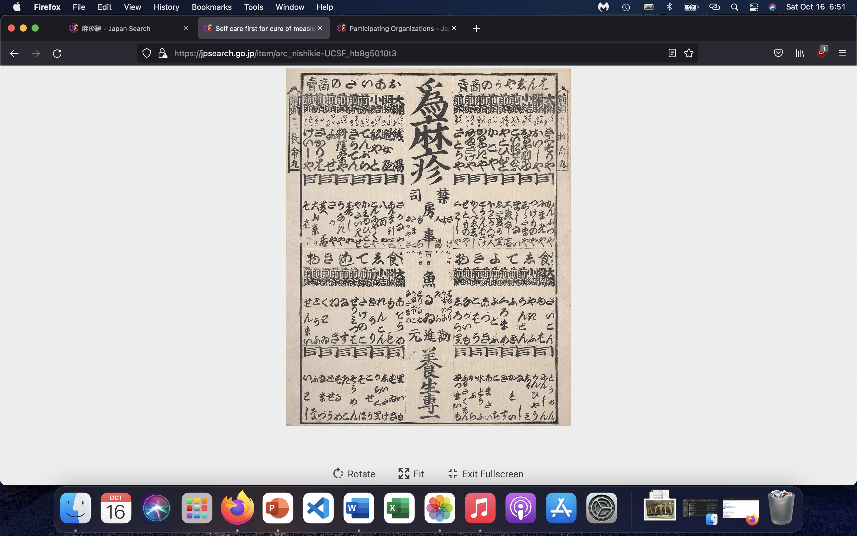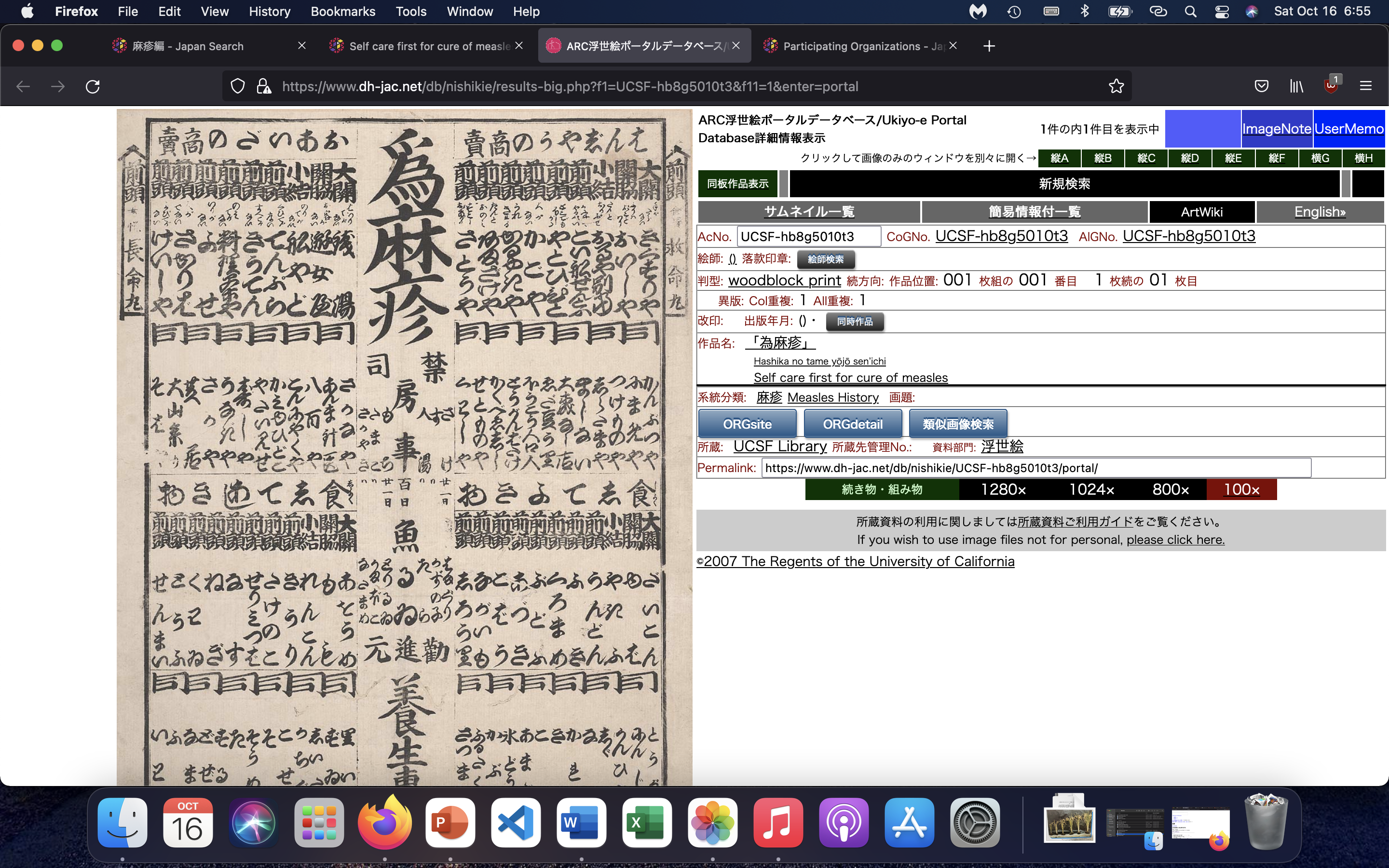 The portal does a very good job of displaying images of manuscripts, texts, and paintings when they are avaliable. I particularly like the “Fullscreen” option which provides a streamlined, almost naked, view of the image files which one can zoom in and out of easily. See for example the images below comparing a ukiyoe displayed in Japan Search and the same ukiyoe displayed in the source database. One should notice immediately, that there is a lot less clunk around the page on Japan Search. The licensing for each image is also clearly displayed. I imagine that Japan Search could become a very useful part of the research arsenal of someone working primarily with visual media.