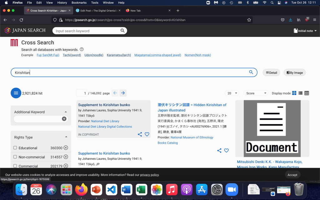 Whilst I have found Japan Search useful for tracking down images that I can use within my publications, it has some major flaws that make it very nearly unusable within my own research. The search function, the core part of Japan Search, simply doesn’t work very well. Japan Search suggests that the user searches for very general terms such as “Fuji San” or “Udon,” but general searches provide very general results. If I search for the term Kirishitan キリシタン, for example, I get a fantastic 4,685 hits or 235 pages of results. These are ordered by default according to “Score,” but could also be ordered according to title, contributor, or date. How “Score” orders results is unclear – on the first page I am presented with an image of an artefact, a selection of post-WWII photographs, a manuscript version Dochirina Kirishitan ドチリナ・キリシタン, and bibliographical information for several secondary sources. If one searches for the same term but in Romanised form, one is provided with a horrific 2,921,824 hits or 146,092 pages most of which are completely unrelated to the desired search. Of 20 results on the first page, only 6 are actually related to the key term. If one uses more specific search terms such as Kirishitanban キリシタン版, for example, one is provided with more specific and potentially more useful results. However, even if one conducts more specific searches with Romanised terms thousands of irrelevant results are provided. This is a problem because sometimes we may want to search for sources written in languages other than Japanese which use Romanised terms in their titles. At present, however, this may not be possible.