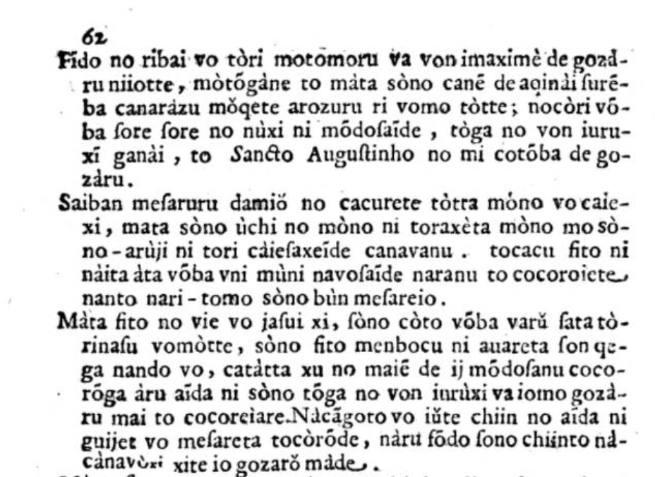 Passage from which the transcriptions were made. Didaco Collado,Niffon no Cotōbani Yô Confesion, Modvs Confitendi et Examinandi (Rome: Sacra Congregatio de Propaganda Fide, 1632), 62.
