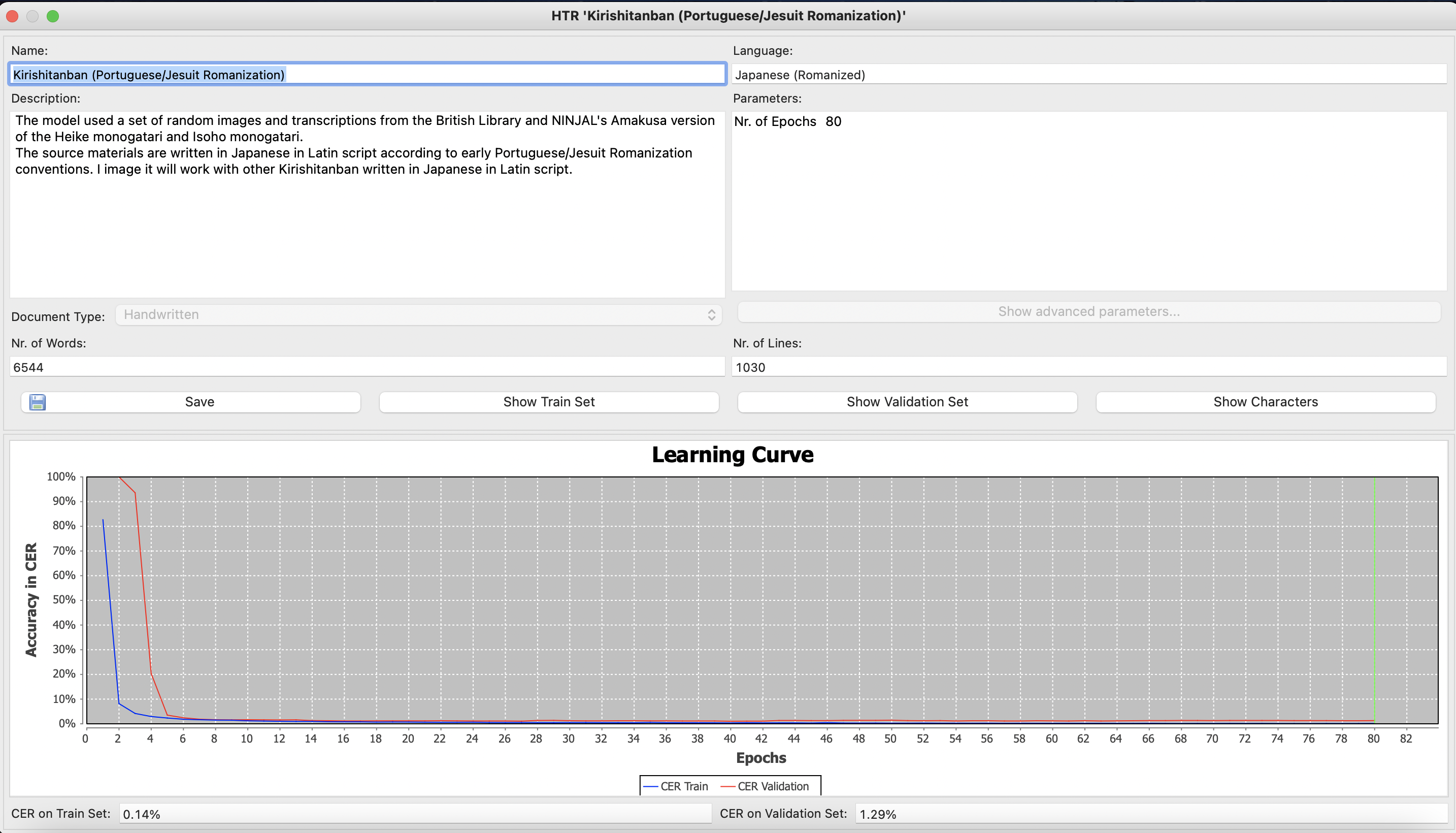The model was trained on 40 random pages consisting of 6,544 words (1,030 lines) of text for 80 epochs. As readers will see in the below graph the model had a 0.14% Character Error Rate (CER, the percentage of characters that have been transcribed incorrectly by the model) for the training dataset and a 1.29% CER for the validation set. It is, therefore, a highly accurate model.