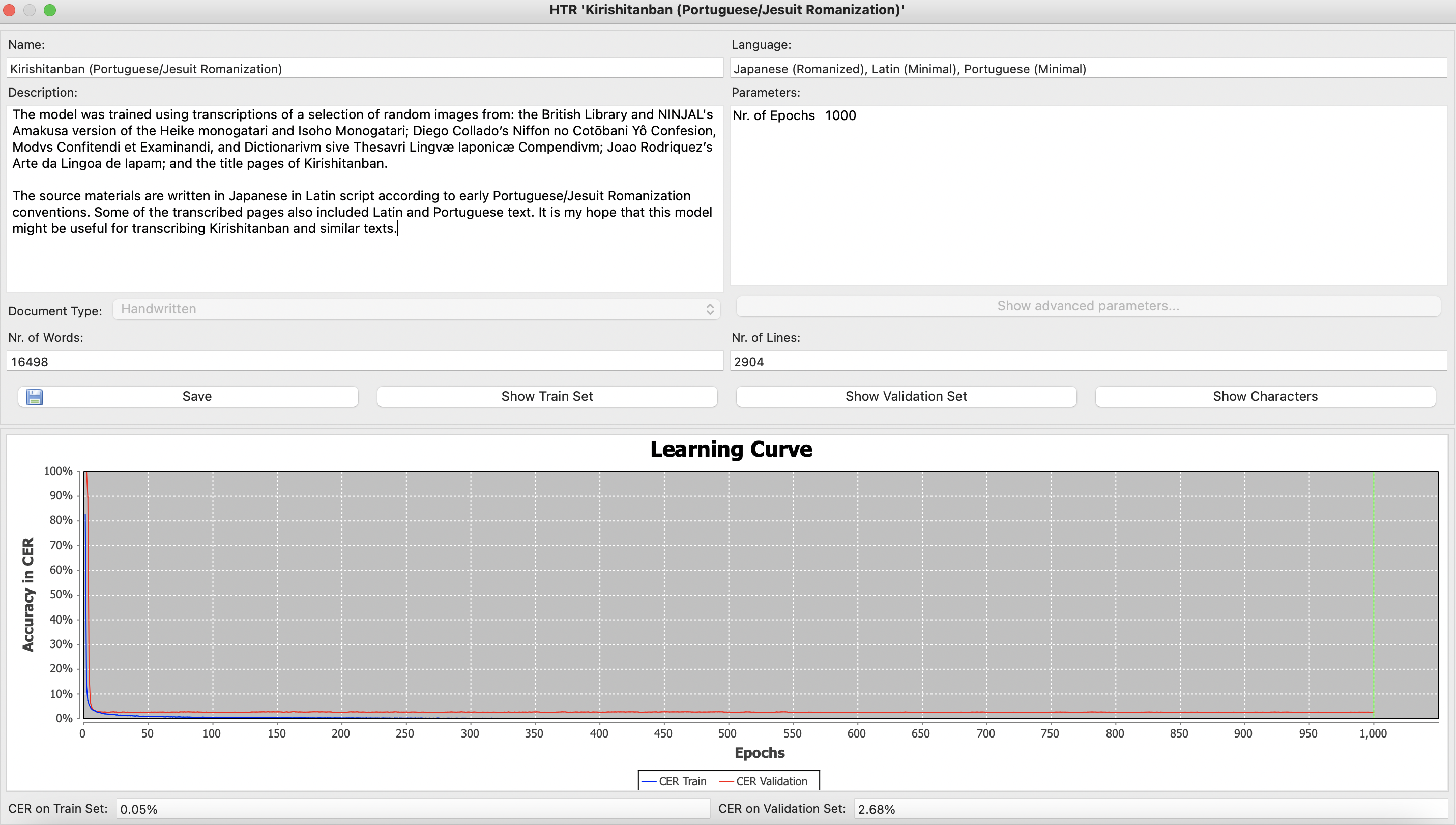 After these favourable results, I decided that I would try to improve the model by expanding the training dataset both with additional images from the BL-NINJAL’s Heike monogatari, Isoho monogatari, and Kinkushū, but also from other Kirishitanban texts written in Romanized Japanese. I added title pages from a number of Kirishitanban and transcribed approximately 30 pages from Didaco Collado’s Niffon no Cotōbani Yô Confesion (1632), Modvs Confitendi et Examinandi (1632), and Dictionarivm sive Thesavri Lingvæ Iaponicæ Compendivm (1632), and João Rodrigues’s Arte da Lingoa de Iapam (1604). These transcriptions added a small amount of Latin and Portuguese language text (and associated characters) into the model as well as italicised text.