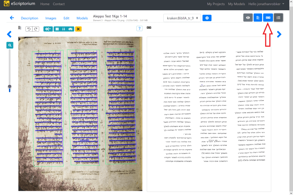 Having finished the segmented the folio, I returned to the “images” tab and selected the folio I had just been editing. There, I clicked the “transcribe” button all the way on the right side of the screen. It asked me to select a model and I chose the appropriate Hebrew model.