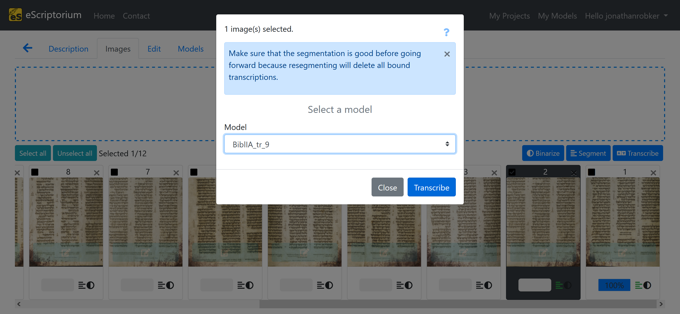 Having finished the segmented the folio, I returned to the “images” tab and selected the folio I had just been editing. There, I clicked the “transcribe” button all the way on the right side of the screen. It asked me to select a model and I chose the appropriate Hebrew model.