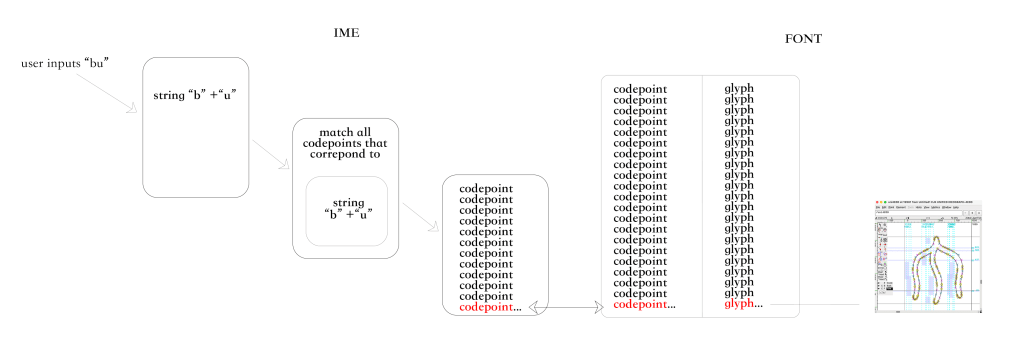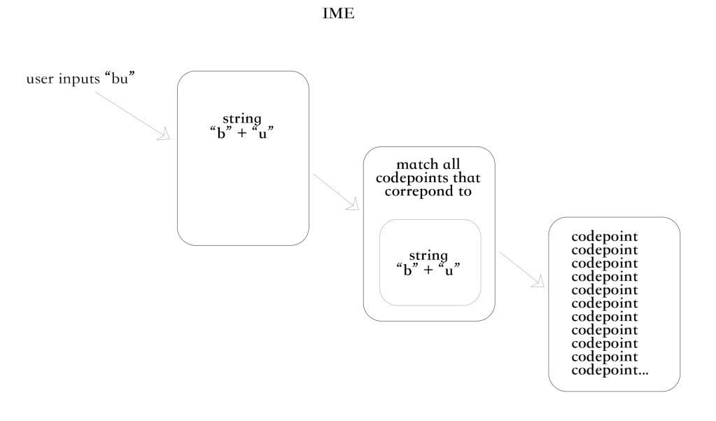 An example helps grasping the concept. My goal is to type in my Word page the word “not” in Chinese, i.e. bu 不. I switch input method by selecting Chinese language, and, since I set my input method to be pinyin based, I type the keystrokes “b” and “u.” The IME receives this string and retrieves all codepoints of Chinese characters with this romanization. At this point, there is a new list of codepoints: all the codepoints that correspond to the string “b-u”. This is one way to visualize the process: