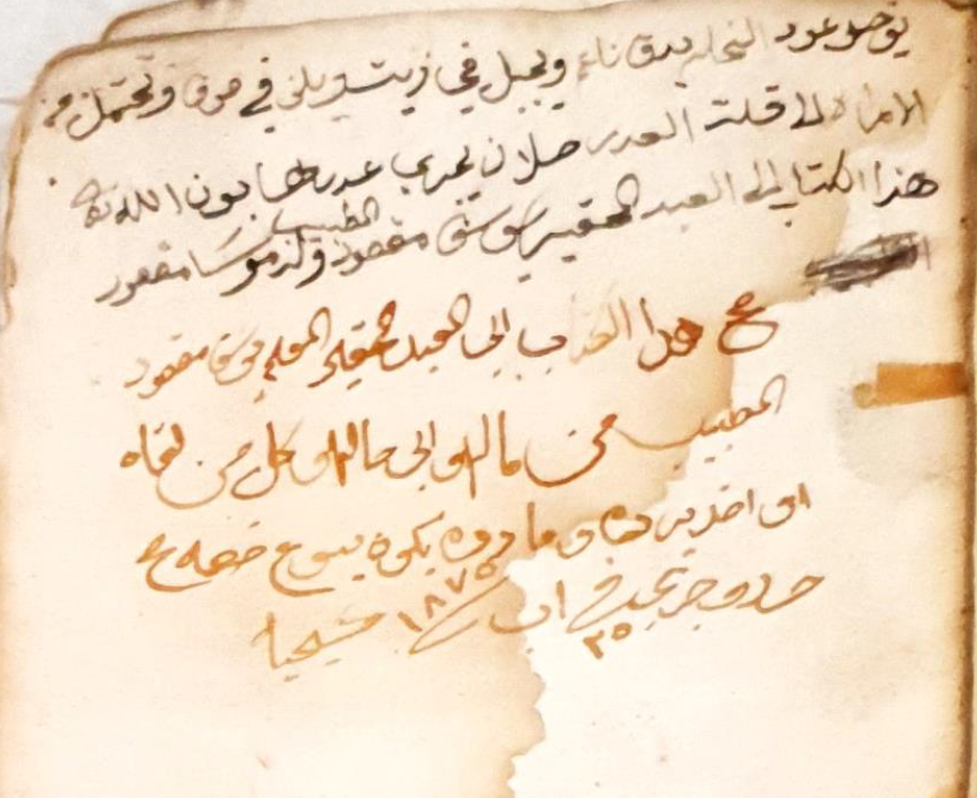 The manuscripts are all leather-bound codices, in differing states of preservation, and copied in Serto (West Syriac) script. While a rough estimate might place them in an early modern Ottoman context, and probably – owing to their script – a Syriac Orthodox, Syriac Catholic or Maronite scribal milieu, establishing their provenance with any certainty is difficult. Certain paratextual features of the manuscripts do, however, offer intriguing snippets of information. The colophon of Kitāb al-Abrāj, though undated, reveals that the manuscript was copied by a student called Mīkhāyīl in Batroun, a town in northern Lebanon;[6] and a note of ownership on the final folio of Kitāb al-Iqtiḍāb is dated 1875, implying its creation predates this time. Quite wonderfully, we get a glimpse into the usage of this particular manuscript from copious notes scribbled throughout it, almost all of which are in Arabic script (rather than Karshuni): aside from recipes for ailments such as swelling and shortness of breath, we learn that after the death of its owner, the doctor Yūsuf son of Mūsá Maqṣūd, the manuscript was passed on to his brother Bishārah.