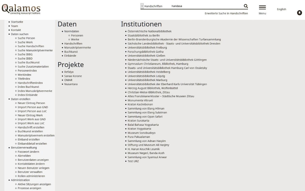 The main objectives are (a) to provide metadata of oriental manuscripts in Germany and (b) to establish and implement common standards for metadata of all entities related to manuscripts. Whereas the earlier ‘Orient-Digital’ application was limited to the collections of the Staatsbibliothek zu Berlin, the new project is creating a portal, now named ‘Qalamos: connecting manuscript traditions’, which provides metadata of Oriental manuscripts from more than 25 collections in Germany. The applicants and main project partners are the following: Staatsbibliothek zu Berlin, Forschungsbibliothek Gotha, Bayerische Staatsbibliothek München, and Universitätsrechenzentrum Leipzig.