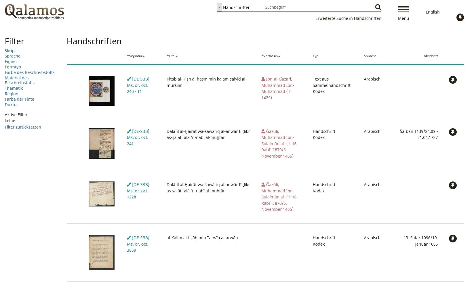 The Qalamos database contains various data modules, among which the modules for manuscripts and persons are the most important. Moreover, it retains the modules for manuscript notes, book bindings, and book art from the earlier applications. It greatly improves on the authority files for persons connected to a manuscript’s history, supporting and easing research on different aspects of manuscript culture. In addition, a new module for works has been created, so that all manifestations (i.e., manuscripts) of one work may be linked to the work-specific data set.