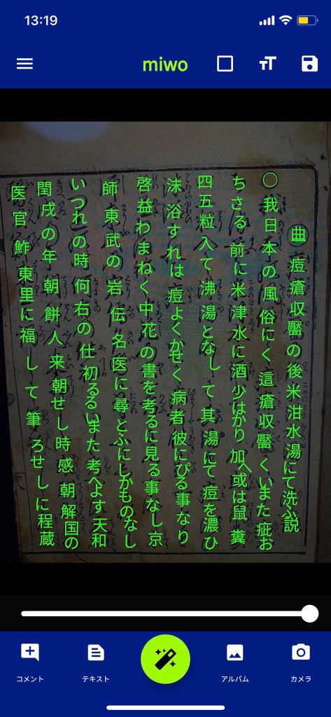 Miwo can potentially help with both of these issues. Miwo allows users to take (or upload) photographs of pre-modern Japanese texts which the app will then automatically transcribe through optical character recognition (OCR) technology. As with all OCR software the app does not produce guaranteed results, but one can use Miwo in order to gain some ideas (or confirm ideas) about unidentifiable characters. As noted, it isn’t always accurate, but I have found that it often offers ideas that help me to think about characters in new ways. For example, it may suggest a wrong character but help me to identify certain radicals present in the character or similar looking characters which when combined with the context of the passage may lead me to a eureka moment.