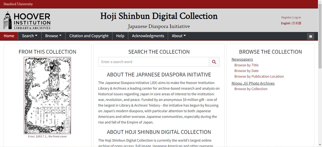 All scholars engaged in the study of the Japanese diaspora can profit from the treasure trove of resources on the internet. From the fields of anthropology, history, linguistics, and others, anyone whose research is linked to Japanese and nikkei migration overseas may find riveting material in the Hoji Shinbun Collection at the Hoover Institution Library and Archives. Linked to the Japanese Diaspora Initiative, this database contains newspapers and photographs, all of them digitized, from institutions in Japan, Brazil, Mexico, and the United States (for a complete list of contributors, check the Acknowledgements page).