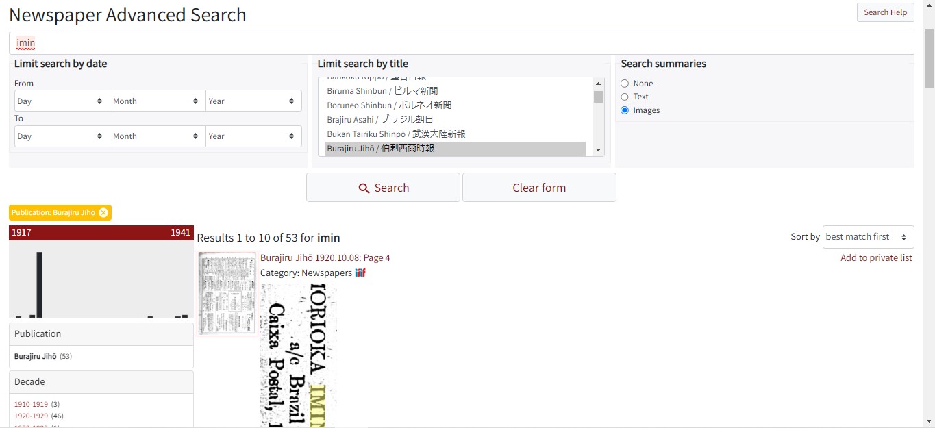 Because my interest is in Japanese immigration to Brazil, I can click on the map and choose one of the six newspapers published here. When we choose the Burajiru Jihō, for example, we are led to a page that contains information about the newspaper, its founders, its period of activity, and other relevant information. Moving to the bottom of the page, we can find the digitized files ordered by year and month, a very convenient way of making them available, particularly if we are looking for an issue whose date we already know. If this is not the case (maybe we are looking for a specific word or name), we can also enter a search word and let the platform’s Optical Character Recognition (OCR) technology help us. Let us look for the word imin (“immigration” in Japanese):