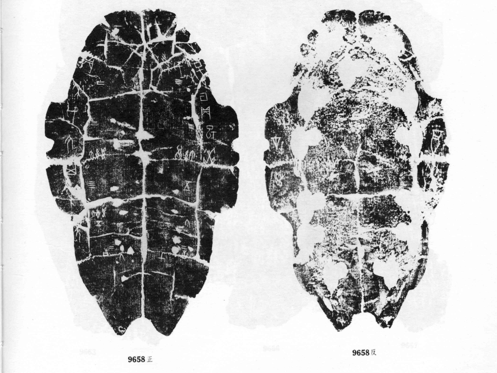 Shang oracle bone inscriptions refer to the inscriptional records of pyromantic divinations conducted by the religious elite of the ancient Chinese Shang 商 dynasty. During divination, hollows drilled into one face of a bone plate (see below, right) – typically a turtle shell or ox scapula – were subjected to intense heat. The rapid expansion of the bone produced cracks on the reverse face (see below, left), which were then interpreted as auspicious or inauspicious omens in relation to a “charge” (e.g., “It will rain tomorrow”). However, it was not until the reign of King Wu Ding 武丁 in the late Shang (c. 1200 BCE) that records of these divinations were first inscribed onto the divination bones themselves. Indeed, these records are the earliest known examples of Chinese writing proper.