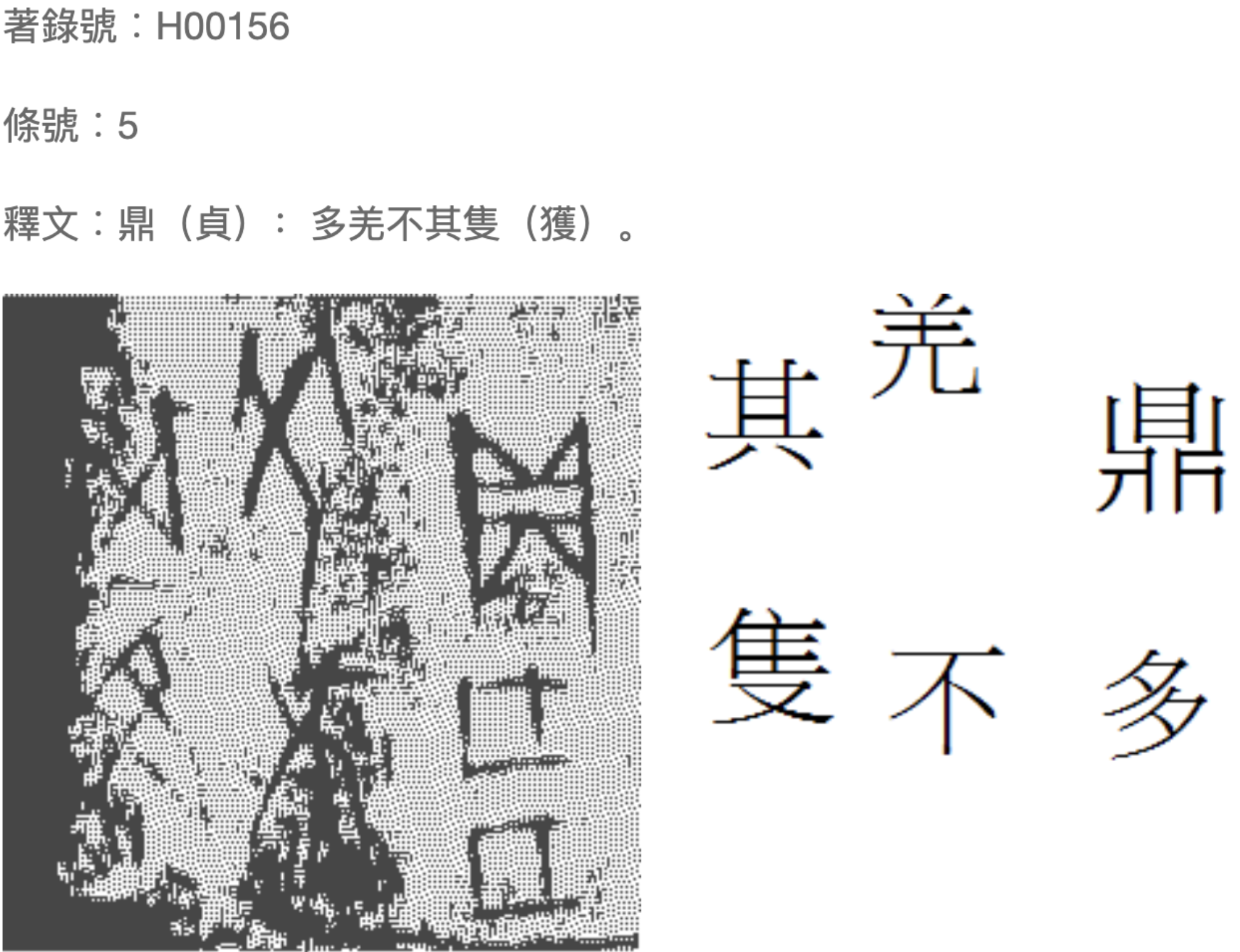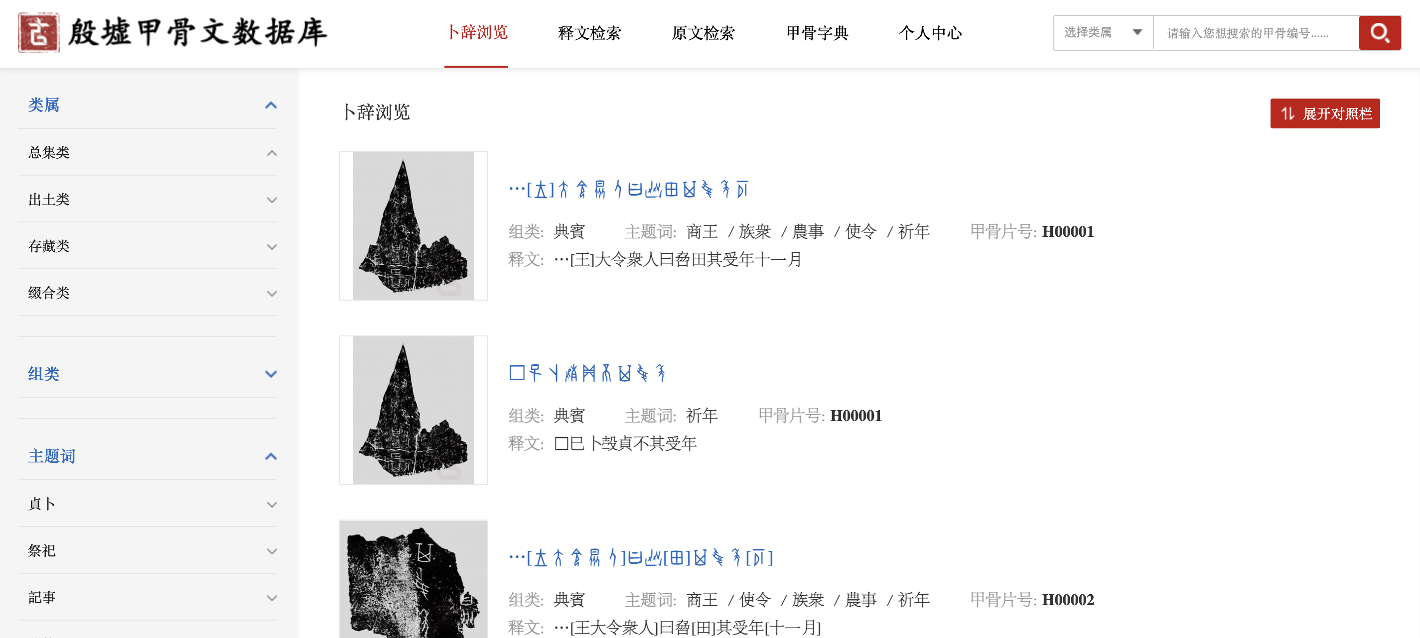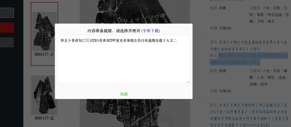 The boxes on the right-hand side of the viewing window display the “original text” (原文) and “interpretation” (釋文) fields in a special, copyrighted font developed by the Zhonghua Book Company which users must download before browsing. The “original text” field ostensibly reproduces the original graphs while the “interpretation” field displays the words the interpreter believes the bone graphs write. Without getting too bogged down in linguistics here, a single oracle bone graph can write several words, and different bone graphs can be used to write the same word.