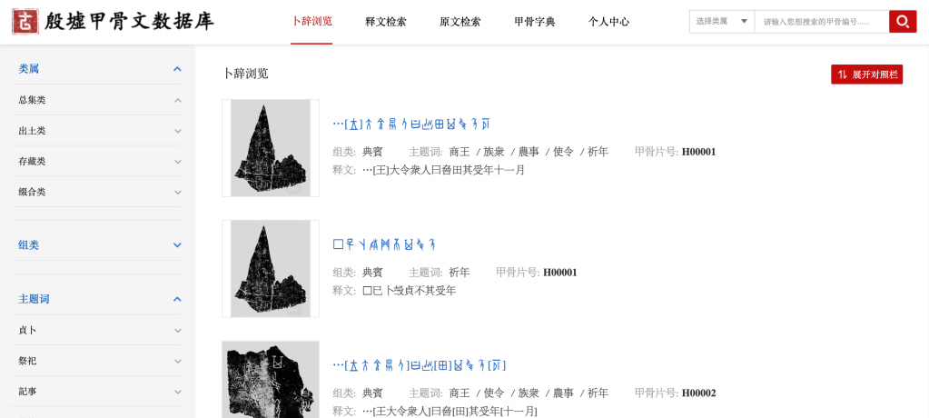 Numbers aside, no other oracle bone database currently provides quite as many powerful filters as the YOD: published collections, excavation sites, institutional and personal collections, reassembled bones, diviner and orthographic groupings, and 32 inscriptional “themes” ranging from “tribute” to “illness and dreams.”