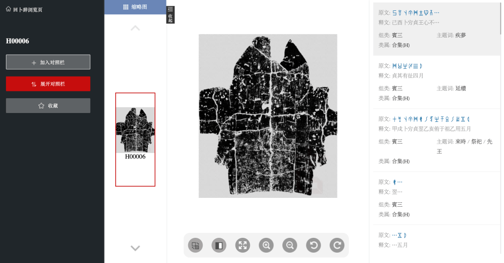 Clicking an inscription from the list opens a viewer displaying the bone rubbing/image/hand-drawn reproduction, its inscriptions, and several useful tools (rotate, invert black and white, zoom). Clicking “Add to Collection” (收藏) saves the current bone to a handy list, while the “Add to Comparison Window” (加入對照欄) allows the user to view multiple bones in the same window.