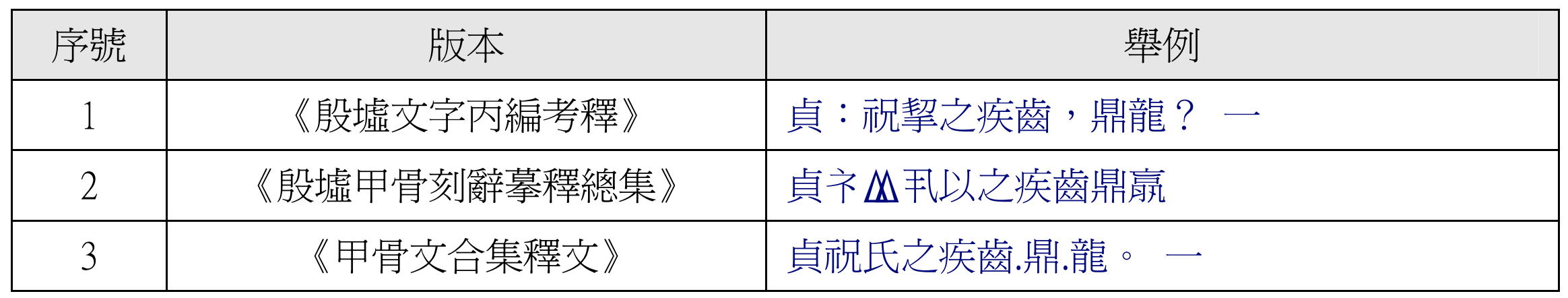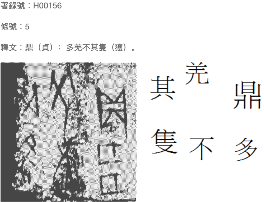 YOD transcriptions appear to be based on the scholarship of the co-developer, Professor Chen Nianfu, but it’s not always clear. The user will sometimes come across interpretations identical to those already published. For the sake of transparency, it would be helpful to know if similarities between the YOD and published interpretations result from the YOD’s digitization process (e.g., OCR-scanning the aforementioned published collections) or the independent evaluation of the YOD’s researchers. Going forward, therefore, oracle bone databases might consider following Academia Sinica, either by listing their sources or by explicitly stating where no sources are used. In addition, providing multiple published interpretations for problematic inscriptions would both alert users to inscriptional ambiguities and allow them to quickly compare possible readings to form their own judgments where appropriate.