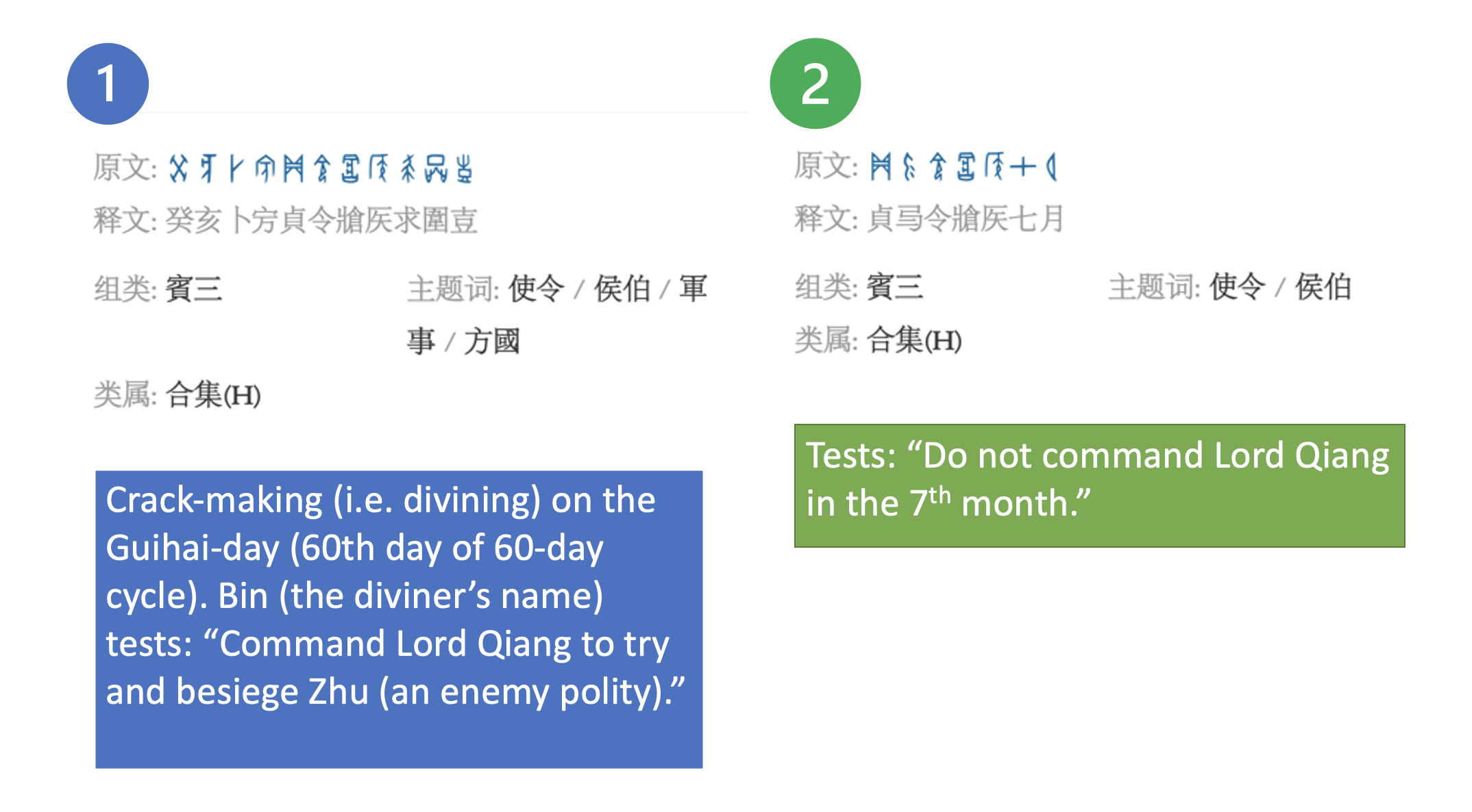 However, this feature of oracle bones also brings into view a slight caveat with the inscriptional “theme” search mentioned above. Let’s take a look at two inscriptions from the same bone: