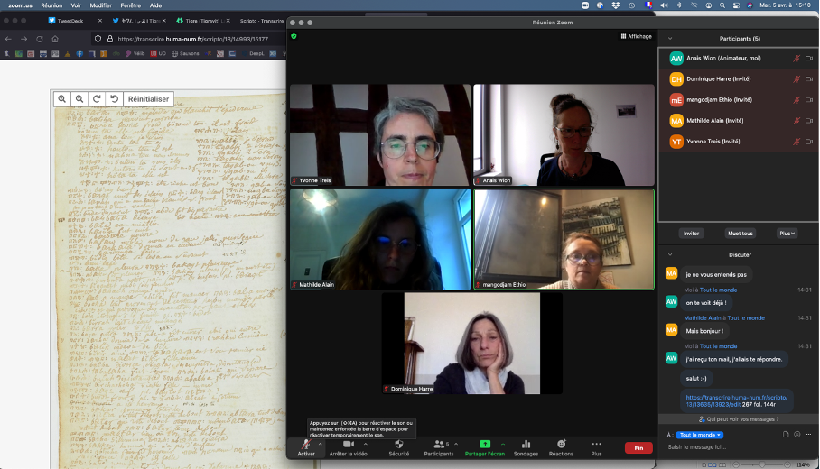 One of them was to organise transcrithons, i.e., moments of collective transcriptions on the model of hackathons. Organised over a day or half-day, they were the occasion to present the project to a specific community and then to transcribe jointly for a few hours. Four events were organised between July and December 2021. The first one gathered colleagues and students working in the field of Ethiopian studies. It was face-to-face and online, with a half-day presentation of the project, the videos of which are accessible on Internet Archives, and a half-day transcription session. It was attended by about fifteen people, and the results were presented here. Two of the participants in this first transcrithon, Yvonne Treis (linguist, CNRS) and Dominique Harre (independent researcher), were later to become pillars of the transcription team, but let’s not jump ahead.