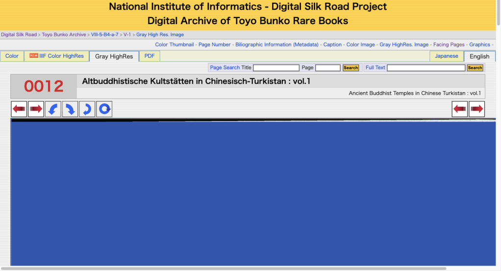 When I was writing my MA thesis on the Buddhist caves of Kizil in modern Xinjiang, I used Toyo Bunko a lot – and let me tell you, it was my cross and delight. The archive has scans of the excavation reports from the 19th-early 20th century excavations in Central Asia. Some of these books are so rare that even after all these years,  I still have not managed to find and hold in my hands any physical copy – I am thinking, for example, of the early travelogs of British army officers, or Russian reports. The fact that a digital copy of these rare books exists at all and is so easily accessible for scholars across the world is amazing in itself. As per the archive’s own description, in fact, the goal of the project is “to make “invisible” books visible [for] everyone. Today surprisingly many books are invisible from the general public because accessibility to precious books is restricted due to their fragility and safety. To let them come out of the dark rooms of libraries, we establish the digital archive of precious books and improve accessibility to them on the Portal site.” The intent is certainly worthy of high praise.