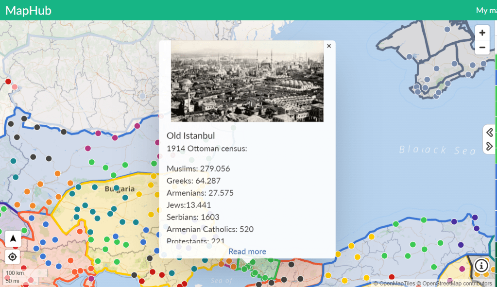 One of the current examples of research done in Ottoman studies using MapHub is the Ottoman Population Atlas prepared by Tufan Kaya. Thanks to this map, the regions and peoples ruled by the Ottoman Empire according to the 1914 census can be examined. Another example is the Sakarya Cultural Inventory prepared by the Center for Ottoman Studies. This second map shows the historical buildings of Sakarya, Turkey, and various data related to these.