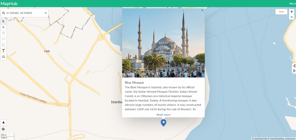 Then, paste the coordinate in the “Search” section in MapHub. The Blue Mosque is now interactively added to our map! At the same time, you can change the names of all the places added on the map with coordinates as you wish from the menu section on the right!