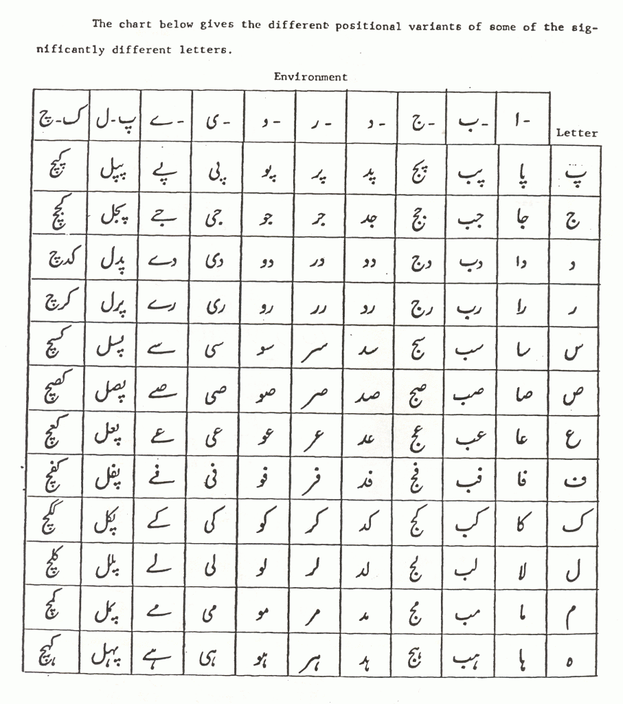 Despite this simplicity, Urdu has a large grapheme inventory, primarily because each letter, except the nine non-connector letters, takes three distinct shapes – initial, medial, and final – relative to their neighbor. Consequently, the combination of n letters in a ligature also contributes to this variability.