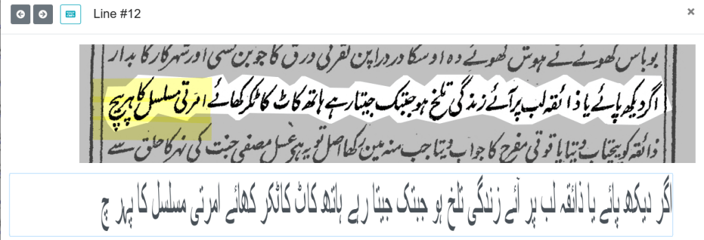 As diacritics for short vowels are optional in Urdu, I also trained a recognition model with a version of the dataset that excluded these signs. My brief testing of the resulting model available here suggests that this approach may produce transcriptions with better Word Accuracy Rates (WAR) – a more meaningful unit for analyzing OCR efficiency for humanities research.