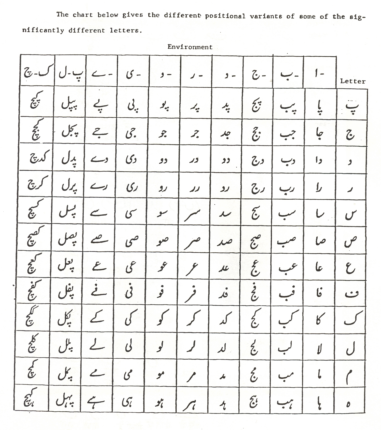 Urdu is mainly written in the nasta’līq style that values aesthetics over legibility. While Urdu letters do not have distinct case forms (small or capital), they can be divided into two major categories: letters that always connect to the next letter in a word, and letters that never connect. In terms of appearance, they can be organized into a handful of series or groups, where a set of letters have identical shapes but differ only in the number of dots (nuqṭa) they have.