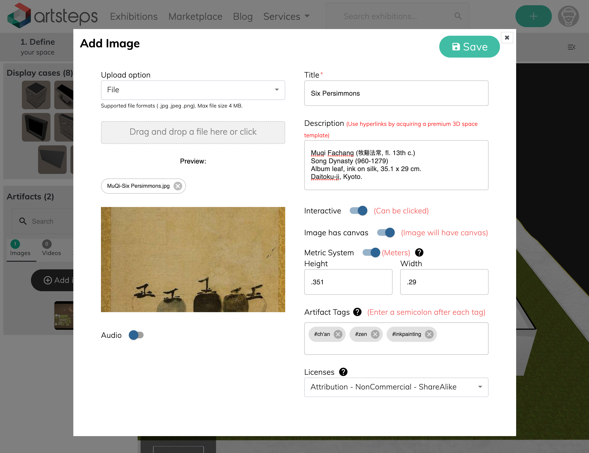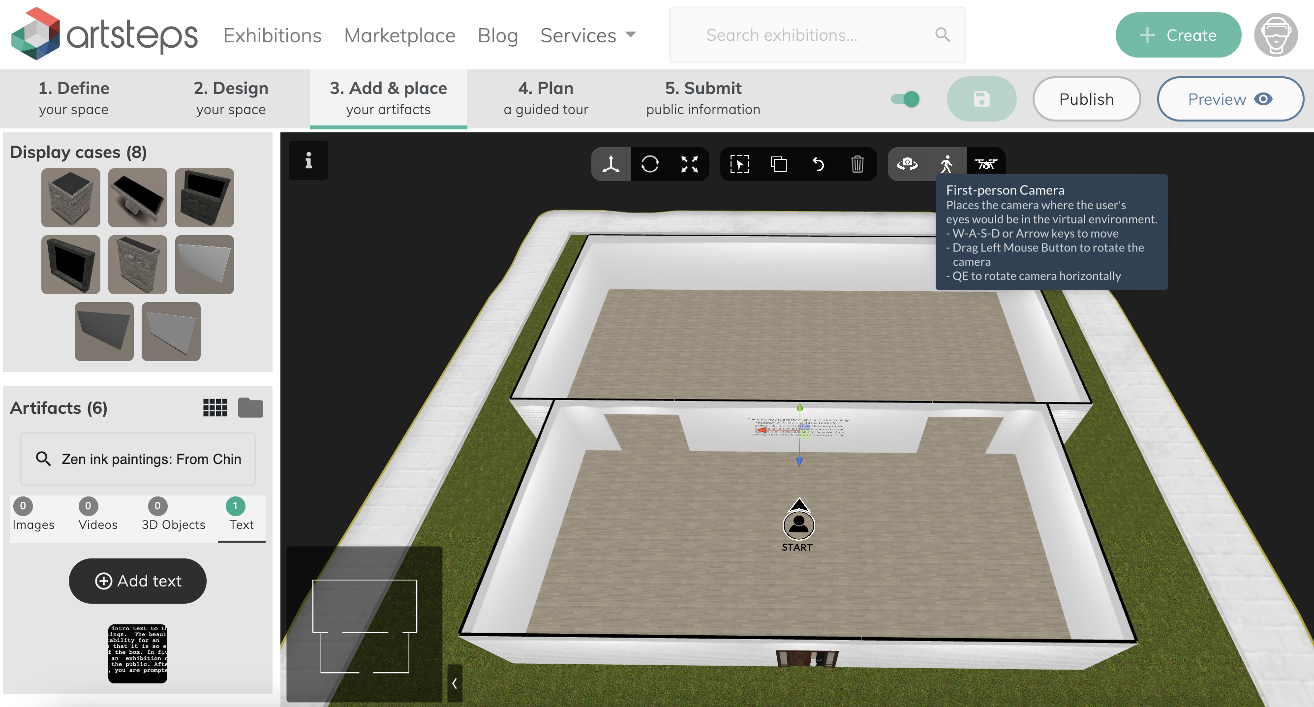 The third step is to populate your gallery with your images, objects, audio files, videos, texts, and 3D objects which are called Artifacts in ArtSteps. Click “Add image” and you can upload files from your computer, paste a url, or search for an image on Flickr. You can also add metadata such as titles, descriptions, height and width, and tags to each artifact. In my assignments, the descriptions are what the object labels are in a real museum. Objects are clickable and the accompanying metadata will be displayed in a popup window. The text artifacts work well as wall labels and exhibition introduction texts. You can also display objects in display cases, as well as adjust the size of your objects or display cases to fit into your virtual space. In literature classes, for example, students might use manuscripts of texts studied in a class into their exhibitions.