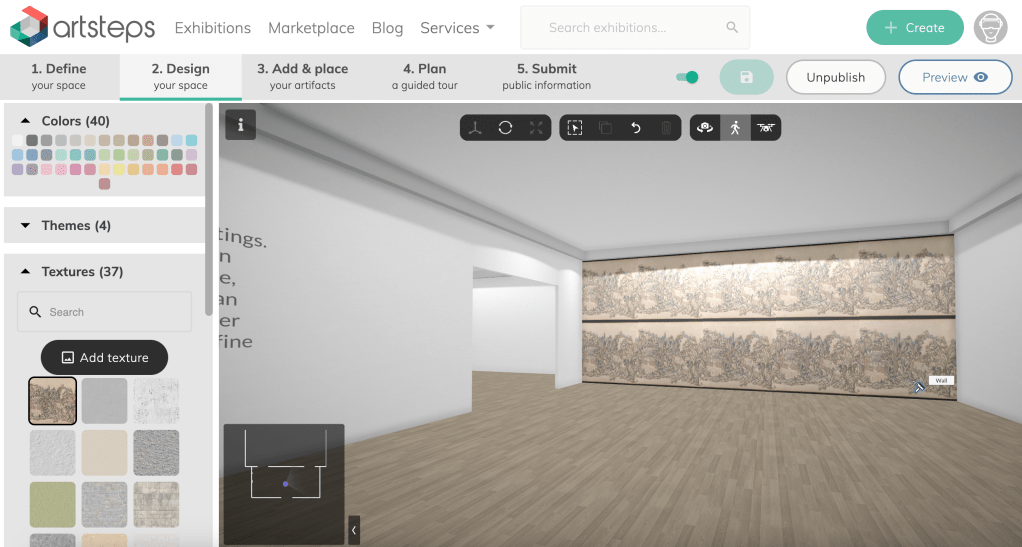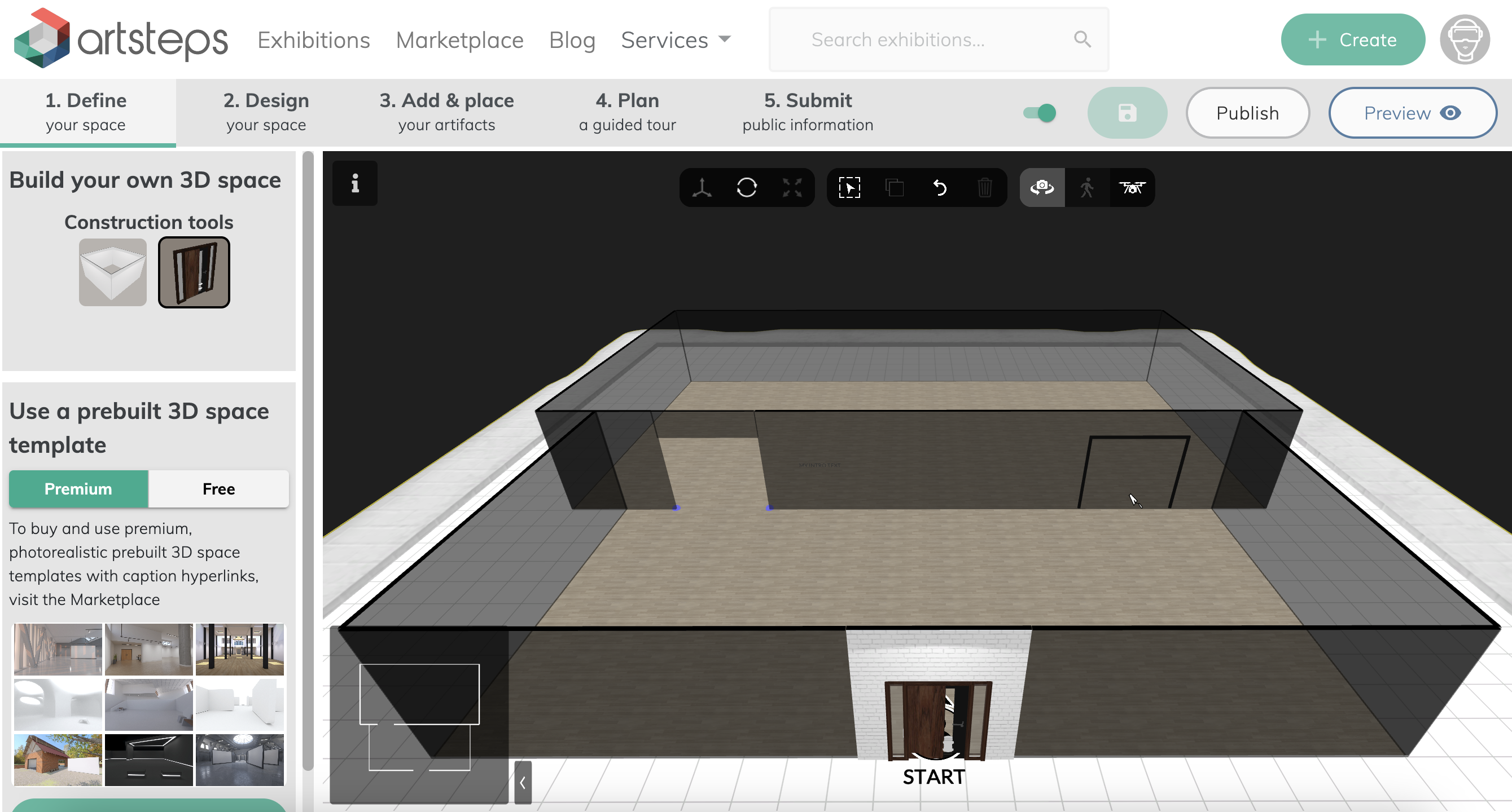 The beauty of ArtSteps, and its suitability for an undergraduate project, is that it is easy to use right out of the box. In five steps, you can have an exhibition online and available to the public. After creating a free account, you are prompted to “define your space.” Here you can use preset templates (some are free, though most must be purchased). However, I would recommend building your own 3D space because it is quite easy and you can tailor it to suit the flow of your exhibition’s pacing and objects. The two construction tools available are building walls and building doors. You simply select a tool, click your mouse (which will appear as a trowel in the virtual space) and drag to build a wall. After you’ve created your walls, select the door tool to open pathways within your built space. One drawback is that you can only create straight walls and the doorways are only one size.