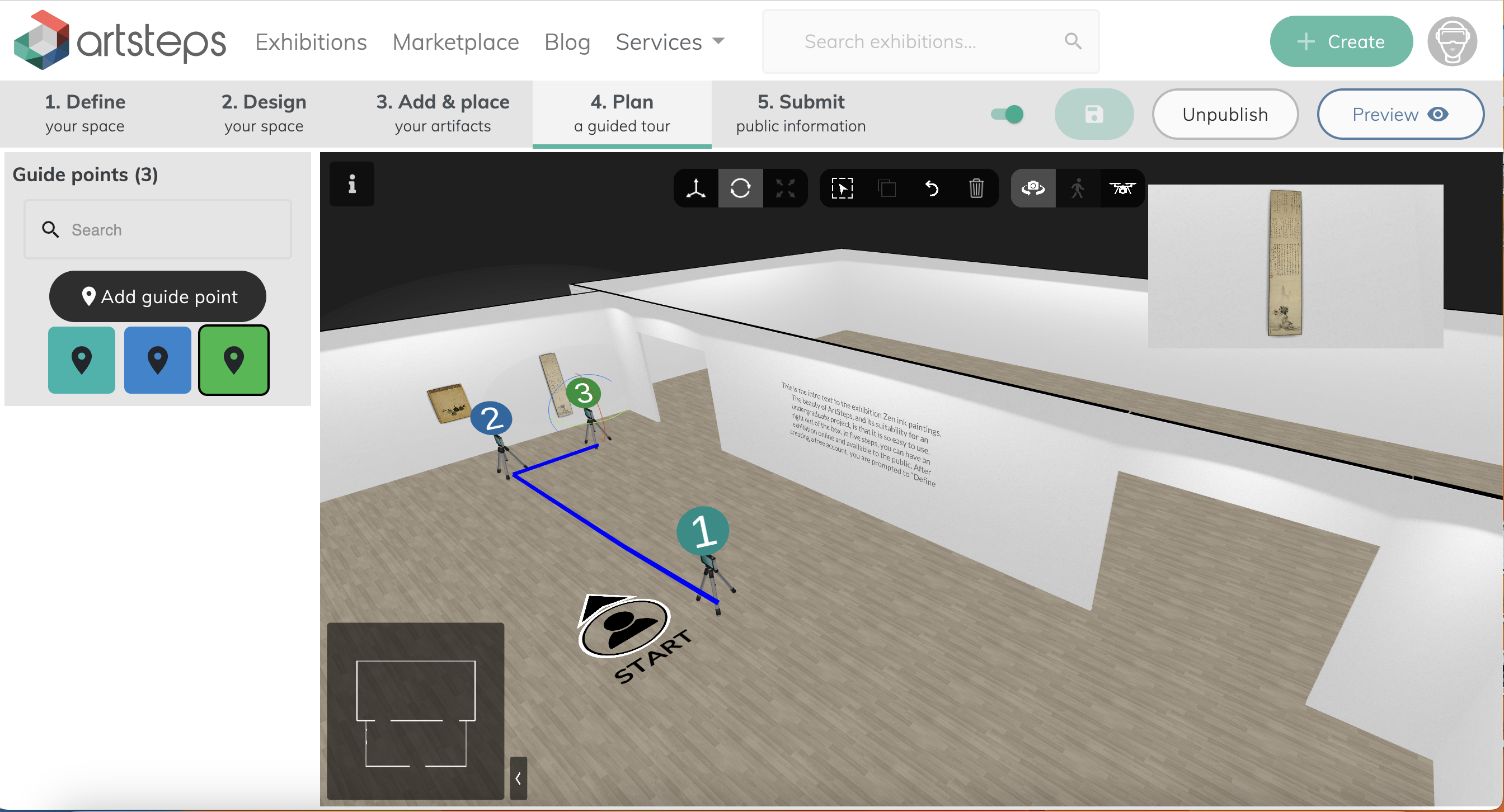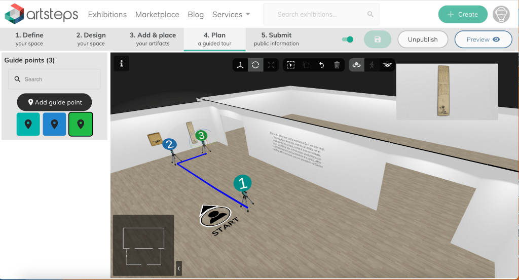 While clever essay prompts might make using these AI platforms difficult, addressing the issue by designing an assignment that is iterative and promotes originality may be a more sustainable option in the long run. A successful alternative to the research paper that I’ve used in the past for my undergraduate classes is to have students design a museum exhibition. Although this is a natural project for students in an art history classroom, it can also work well for subjects where visual, material, or textual culture is used as a primary source (ex. history, archaeology, and literature classes). In this post I’d like to introduce a free and easy to use online tool called ArtSteps that can be leveraged in any classroom to build engaging virtual exhibitions.