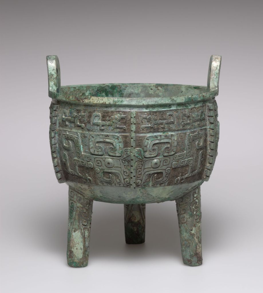 From the accidental discovery of a bronze “three-legged cauldron” (ding 鼎) during the reign of Emperor Wu of Han 武漢帝 in 116 BC, heralded as an auspicious dynastic omen, to the beginnings of epigraphic scholarship in the Song 宋 dynasty (960-1279 AD), ancient Chinese bronzewares have held a distinguished place in the Early Chinese material record. And it’s easy to see why. Many so-called “bronzes” – ritual vessels, bells, weapons, and implements – are thickly set with intricate, tortuously spiraling designs. We can only imagine the impression they must have made on their contemporaries when the copper in the bronze alloy had not yet oxidized, and these greenish wares were still golden and polished.
