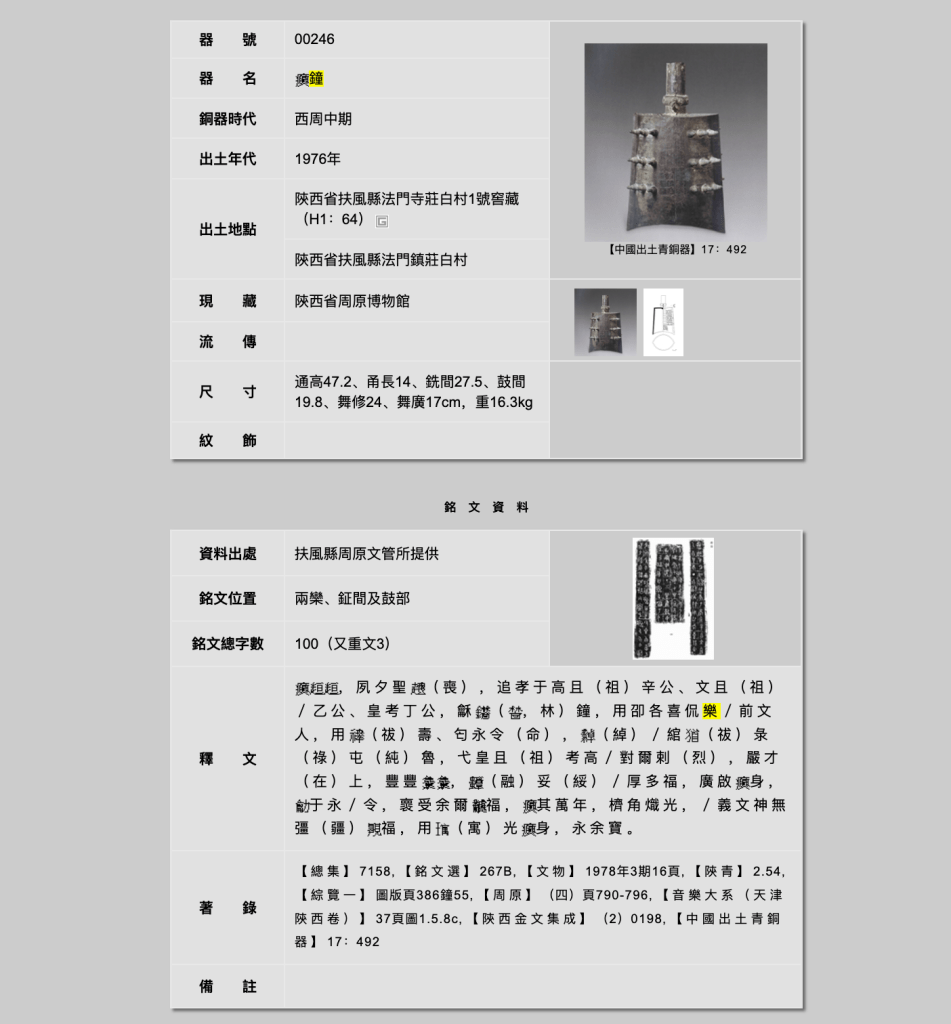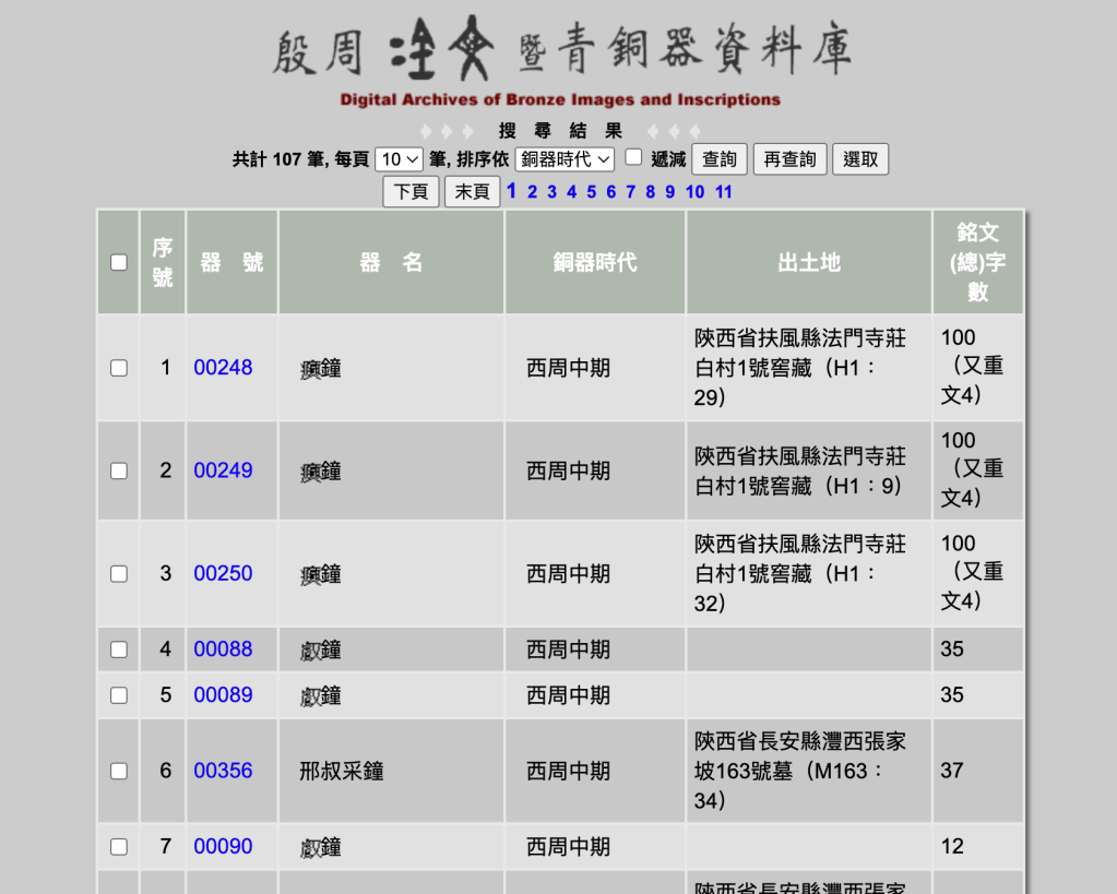 Returning to the search engine, let’s suppose we want to find inscriptions on bronze bells that include the word yue 樂, “music, dance.” Entering zhong 鐘 “bell” into the bronzeware name field, and yue 樂 into the interpretation field, we get the following 107 results:
