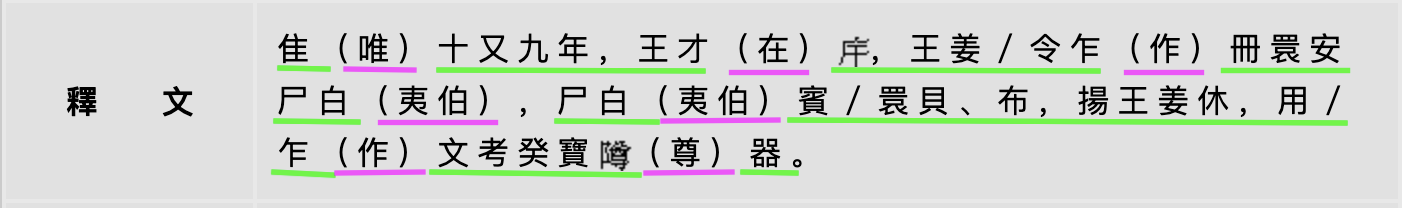 The interpretation field contains both a transcription of the bronze inscription in “Regular Script” (kaishu 楷書) style Chinese characters (underlined in green), and clarifications identifying the word written by these graph[s] (underlined in pink). Because transcriptions and interpretations are thus intermixed, searching for an expression like qian suxi 虔夙夕, “reverently [working away] from dawn till dusk,” will not return every meaningful instance of this phrase. To understand why, we need to know something about the nature of early Chinese texts.