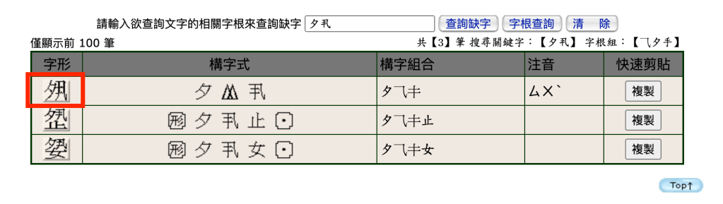 The second column from the right represents graphs using a system specially developed by Academia Sinica – the “character composition formula” (gouzi shi 構字式). These formulae paruse characters into components and structural symbols. The structural symbol in the formula “夕 +