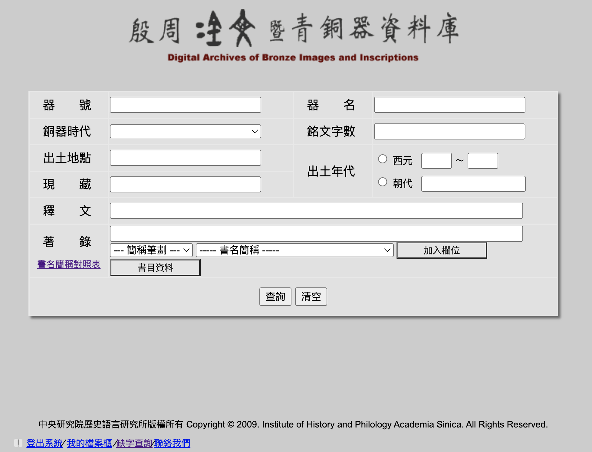 Search queries can be formed by combining the jicheng collection number (qi hao 器號), bronzeware name (qi ming 器名), periodization (tongqi shidai 銅器時代), inscription length (mingwen zishu 銘文字數), excavation site (chutu didian 出土地點), excavation period (chutu niandai 出土年代), current collection (xianzang 現藏), interpretation (shiwen 釋文), and publications (zhulu 著錄) – standard criteria across bronze inscription databases. Because bronzes are conventionally named using the formula “[donor] + [vessel type]” (e.g. Shi Qiang pan 史墻盤 = “the pan-basin commissioned by Scribe Qiang”), the bronzeware name search box can also be used to find inscriptions on specific vessel types.
