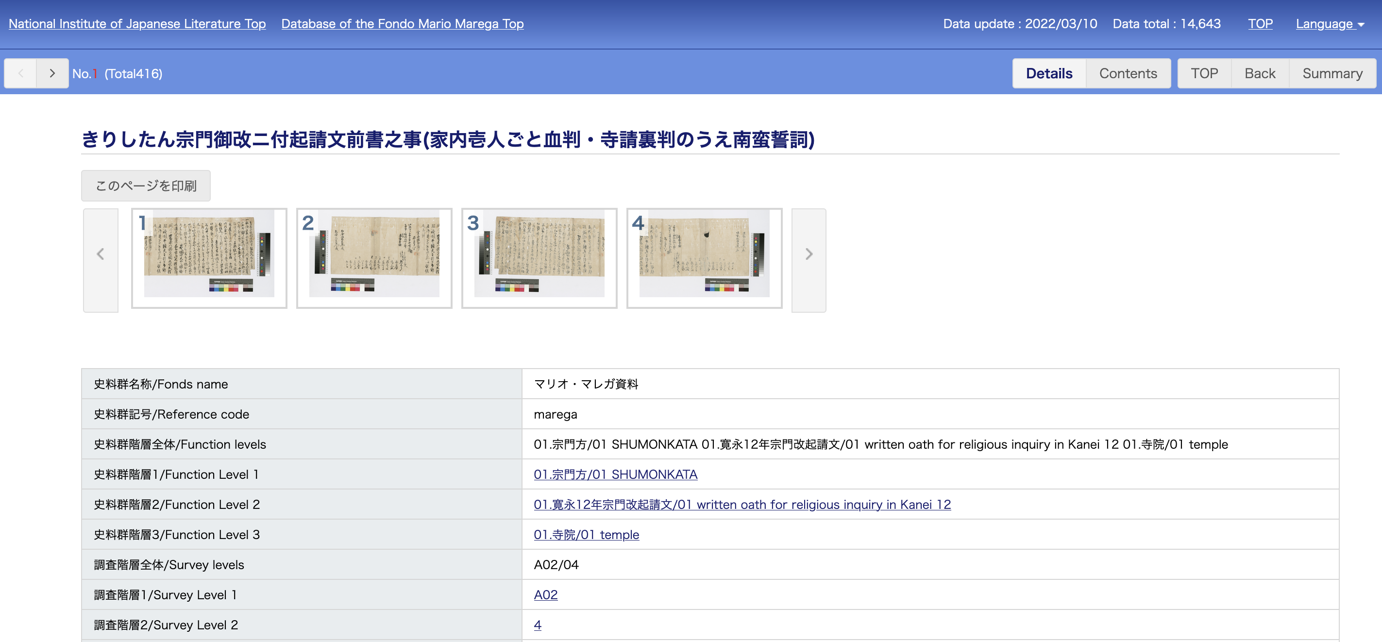 The Marega Collection consists of a huge number of records (14,643 items in total) pertaining to Christianity (or more correctly its persecution) and population trends in pre-modern Japan. They are written in Japanese, Italian, English, and German. of These include 11,938 records from Usuki Domain’s Office of Religious Affairs, 413 miscellaneous records, a collection of 2236 documents composed by Mario Marega (1902-1978, the creator of the collection), and a 56 other records. NINJAL has digitized the entire collection and has prepared an accompanying catalogue and metadata. These can be accessed through the Marega Collection Database’s website. In this article, I’ll provide a brief review and guide.
