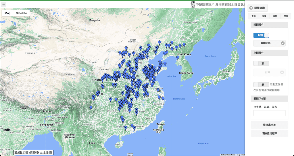 Part I of this two-part assessment of the Academia Sinica’s bronze inscription research tools examined key features of the ‘Shang and Zhou Bronze Inscriptions and Bronzewares Database’ (殷周金文暨青銅器資料庫): the search function, the database transcription conventions, and the missing graph system. In this second part, we turn to another of Sinica’s major bronze research tools, the ‘Shang Zhou Bronzeware Geographical Information System‘ (殷周青銅器地理資訊系統), which the editors suggest might support future research into regional inscription styles, clan migrations, and elite marriage networks. Additionally, I will also review two other Sinica databases providing alternative points of entry into bronze inscription research: the ‘The Lexicon of Pre-Qin Oracle Bone Inscriptions, Bronze Inscriptions, and Bamboo and Wooden Documents’ (先秦甲骨金文簡牘詞彙資料庫), and the ‘Bronze Inscription-Related Publications Database’ (金文關係文獻資料庫).
