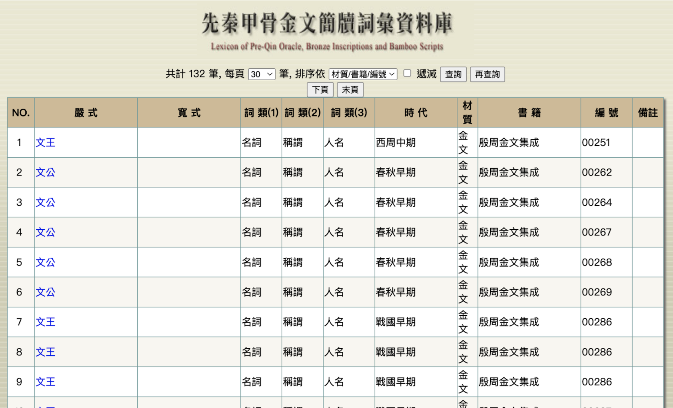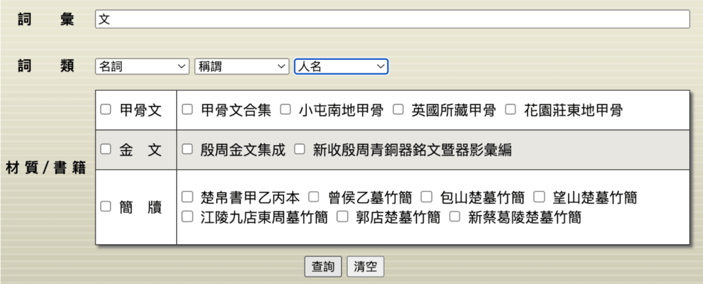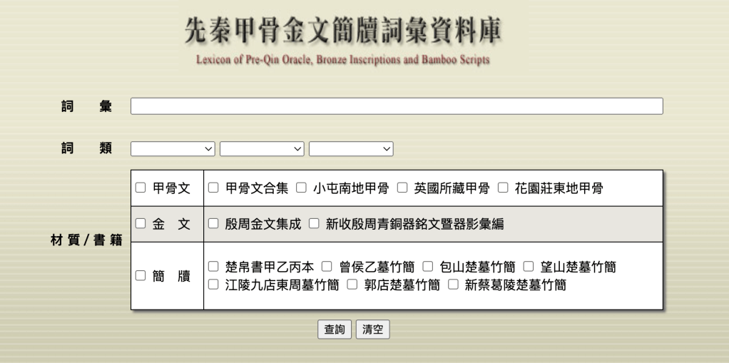 The Lexicon of Pre-Qin Oracle Bone Inscriptions, Bronze Inscriptions, and Bamboo and Wooden Documents (先秦甲骨金文簡牘詞彙資料庫)
