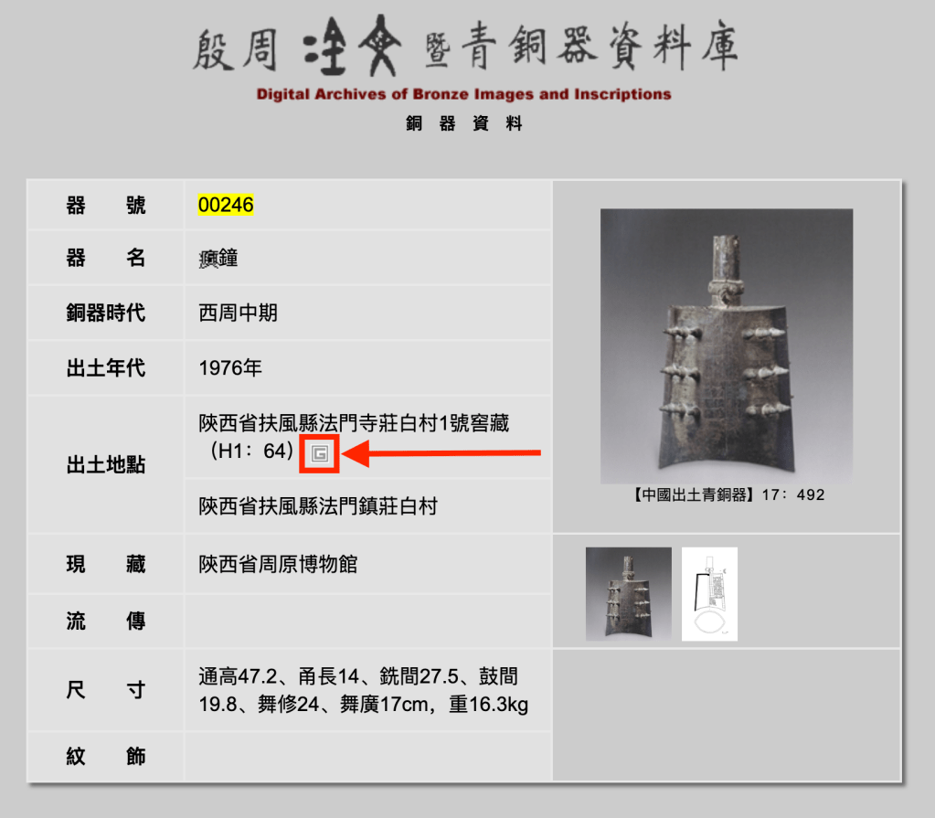 Developed in collaboration with Academia Sinica Geographic Information Science Research Centre, Sinica’s GIS system links inscribed bronzes with geospatial excavation site data to create a comprehensive and searchable map of inscribed bronzes. In line with Sinica’s overall ‘ecosystem’ structure, this GIS system is seamlessly integrated into the ‘Shang and Zhou Bronze Inscriptions and Bronzewares Database’ (殷周金文暨青銅器資料庫), allowing users to move quickly and conveniently between transcriptions and geospatial data. To access excavation site data for a provenienced bronze, users can click on the icon under the ‘excavation site’ (chutu didian 出土地點) information provided in the Shang and Zhou Bronze Inscriptions and Bronzewares Database (Figure 1).