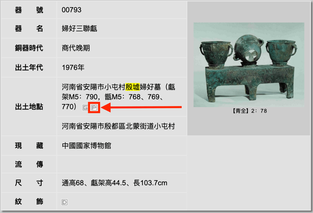 icon for ‘Fu Hao Triplicate Yan-steamers‘ highlights their location in the northeastern corner of the Late Shang consort Lady Fu Hao’s tomb. Inscribed bronzes from the same tomb are listed on the left and highlighted in blue. This feature provides a highly convenient alternative to determining a bronze’s location within a site or tomb using its original archaeological site report.