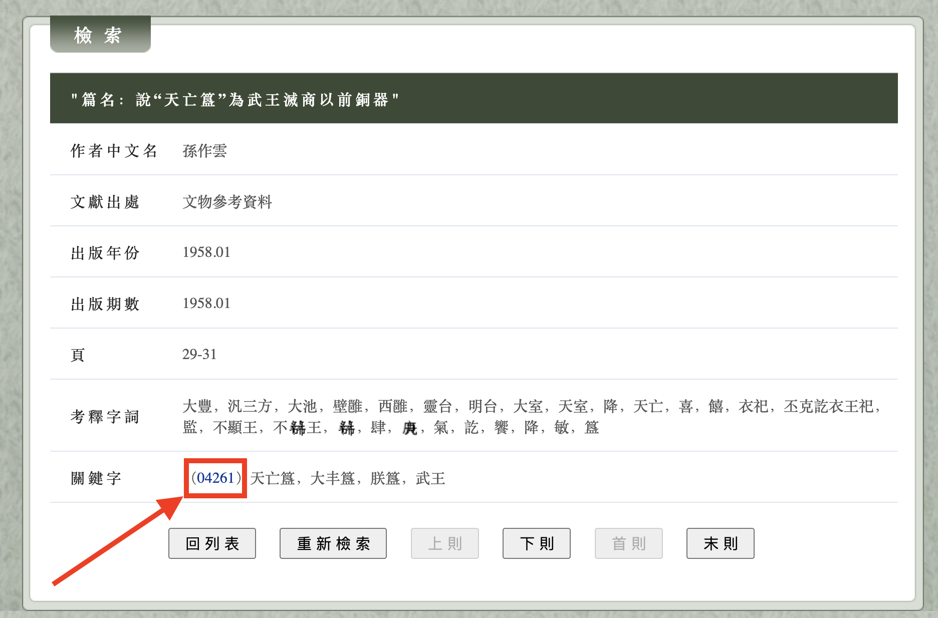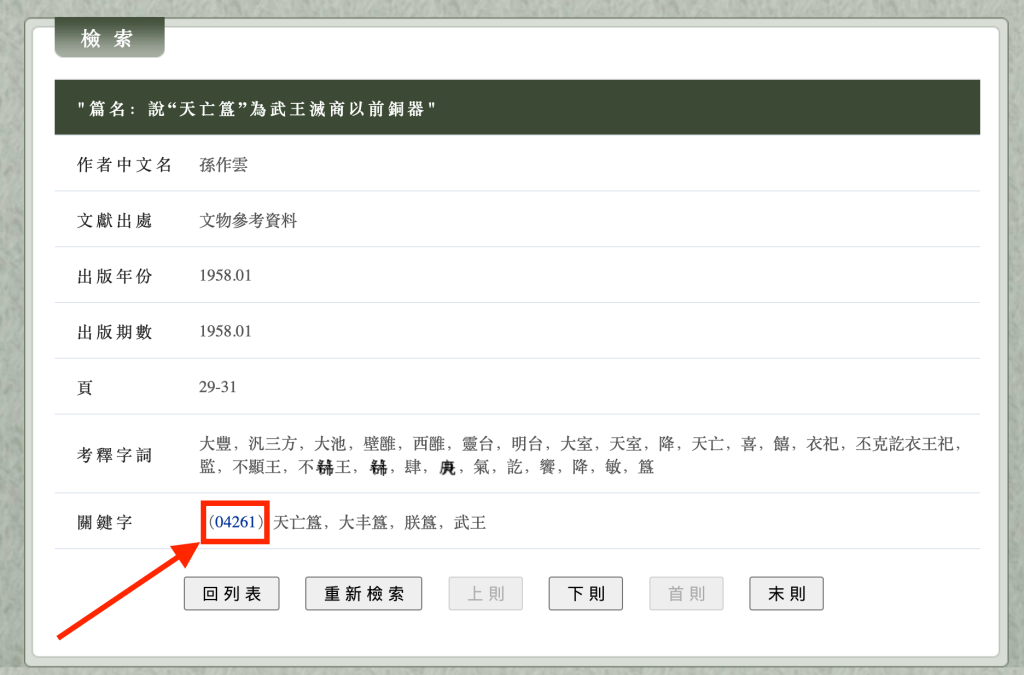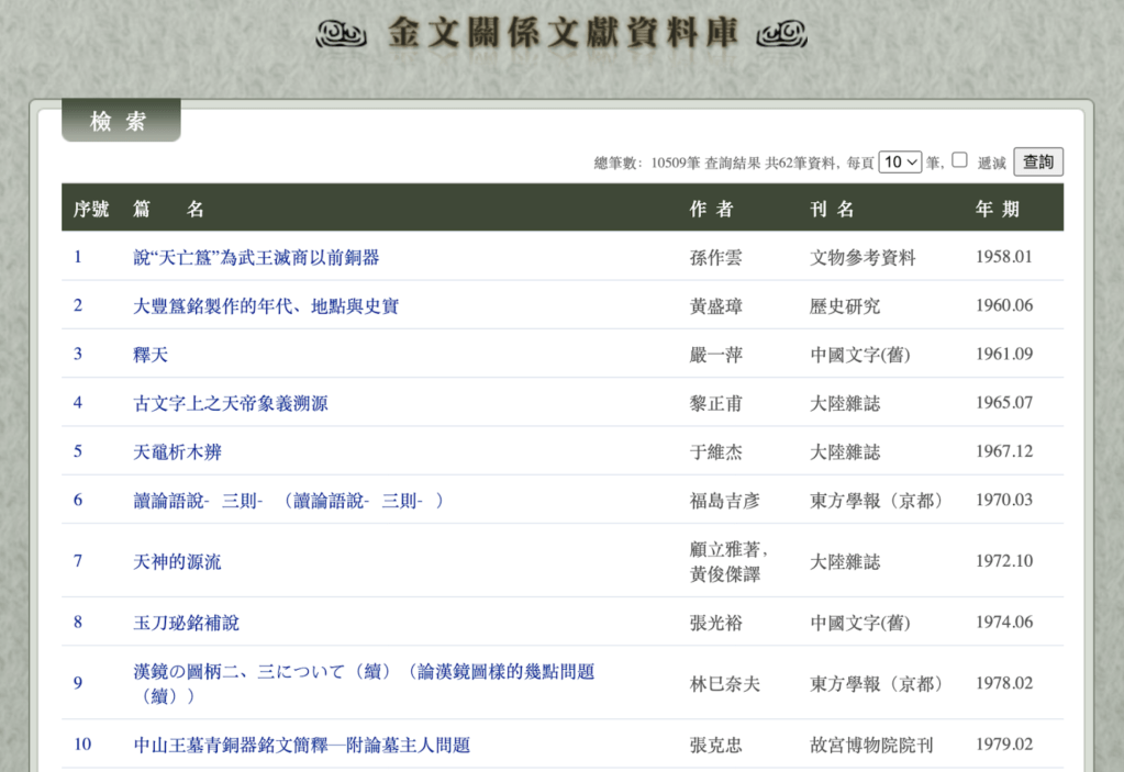 Finally, the ‘Bronze Inscription-Related Publications Database’ (金文關係文獻資料庫) offers yet another starting point for research. Bibliographic entries are provided for some 10,509 Chinese and Japanese publications (mostly pre-2000 with some newer journals), searchable by keyword, article name, author, journal, year, and published transcriptions. A search for articles that discuss bronze inscriptions containing the graph tian 天, ‘Heaven, sky,’ returns 62 results:
