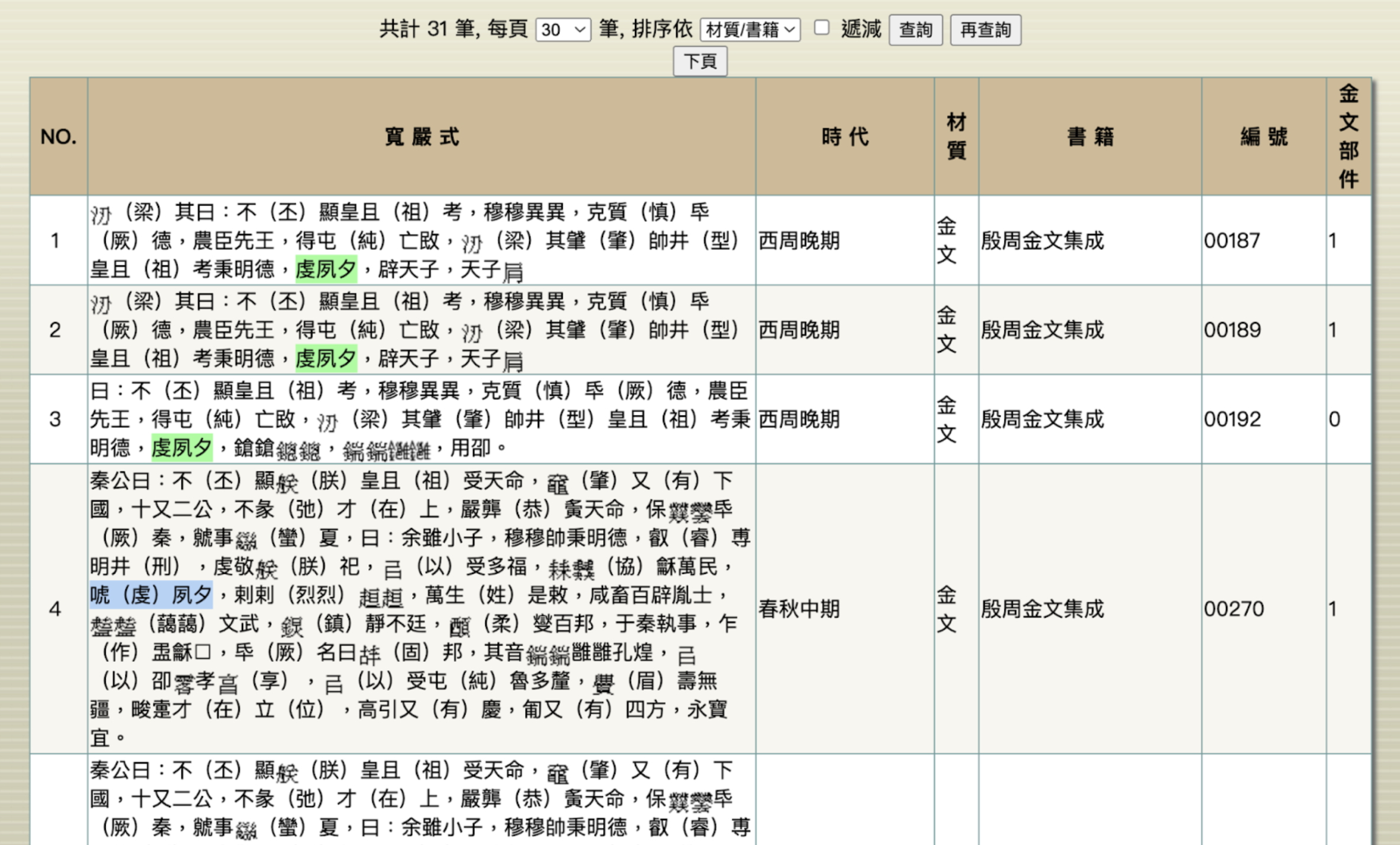 In Part I, we discussed problems introduced by exact search feature in the ‘Shang and Zhou Bronze Inscriptions and Bronzewares Database.’ To recap, searching for a string like qian suxi 虔夙夕, “reverently [working away] from dawn till dusk,” only returned inscriptions in which these exact graphs (虔夙夕) – or, more accurately, these normalized clerical script (lishu 隸書) forms of the original bronze graphs – are used to write the words qian suxi 虔夙夕. The results thus excluded cases where the words qian suxi 虔夙夕 are written using different graphic forms. The Lexicon database ‘full-text’ search function, on the other hand, performs a ‘fuzzy’ search. If we search for the string qian suxi 虔夙夕, “reverently [working away] from dawn till dusk,” the results will include inscriptions where alternative graphic forms are used to write the words in the queried expression (e.g. in Figure 13, hu 唬 writes qian 虔 ‘reverently’).