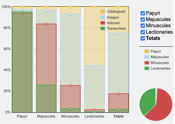 As you can see, most of the Papyri and Majuscles have been indexed. However, there are still plenty of Majuscles that need to be indexed. In addition, the vast majority of the Minuscles and Lectionaries also need to be indexed. In total, only 17.61% of the pages of manuscripts have been indexed. Therefore, if you plan to transcribe a manuscript that has yet to be indexed or want to help, please index manuscripts!