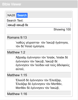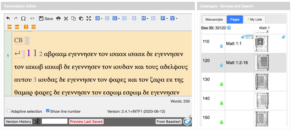 The Bible view on the right side of the screen is a helpful aid for indexing the manuscript. The text of Nestle Aland28 is available for comparison. A search box is also available that can be especially helpful when transcribing a lectionary. By way of example, the top of the page on PageId 120 looks like this: