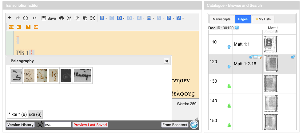A couple of aids exist to help in transcribing especially difficult ligatures. First, a little search box beside the chi-rho ligature is at the bottom of the Transcription Editor box ☧. If you search for letters and words that you think the text in question might be, suggestions and images populate the screen for you to compare. For instance, typing in και provides some pictures of known ligatures for this word.