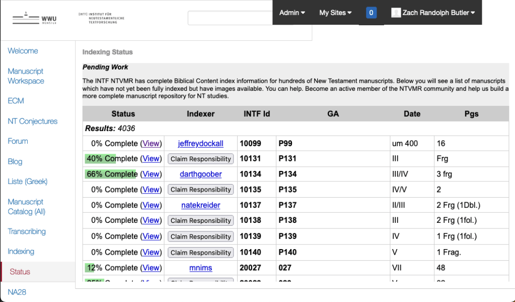 To do so, simply click on Status on the menu bar, and you will be redirected to a page containing every manuscript in the database ordered by the prefix type from one to four. As a reminder from the last post, 1 indicates papyrus, 2 indicates a Majusclue, 3 indicates a Minuscle, and 4 indicates a Lectionary. This list of manuscripts will also present a percentage of how much each manuscript has been indexed and a button labeled Claim Responsibility if it has not been selected. Otherwise, the screen name of the user who has signed up to index the manuscript will appear.