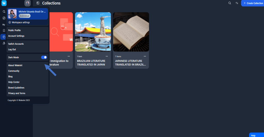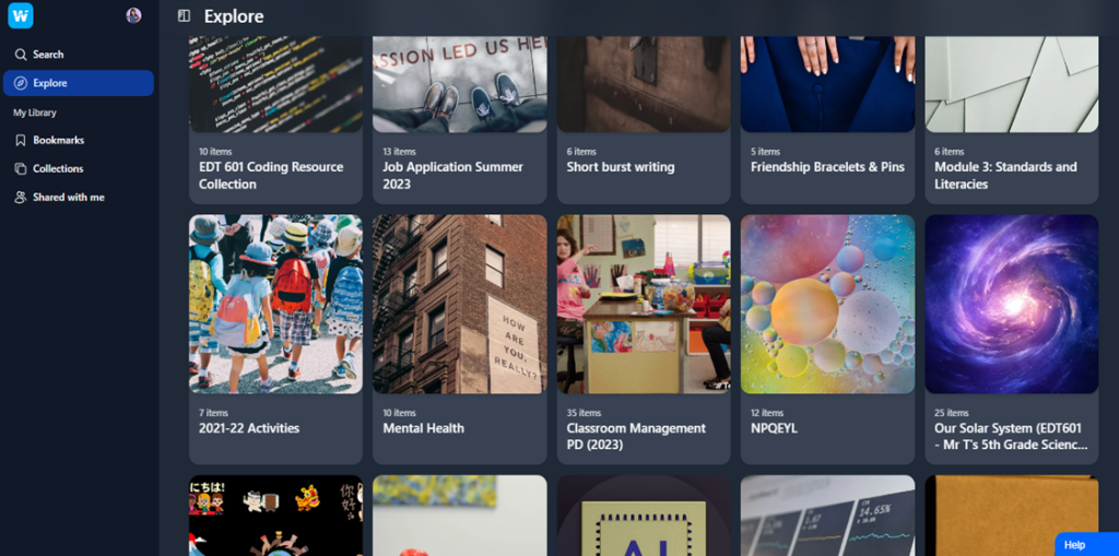 There are seven different free templates to start: newsletter, to-do list, choice board, weekly planner, lesson plan, reading list, and research collection. You can also start from scratch and add your items simply by clicking on the blue rectangle on the upper right corner of the screen labeled “create collection.” You can also switch to the dark mode from the main menu. I signed up with my Google account, so my picture is already there; when using a non-supported e-mail server, it is possible to upload a picture as in many other online tools, in “Public Profile” -> “Edit.” You can, of course, edit your header picture and user name and add a short bio and social links.