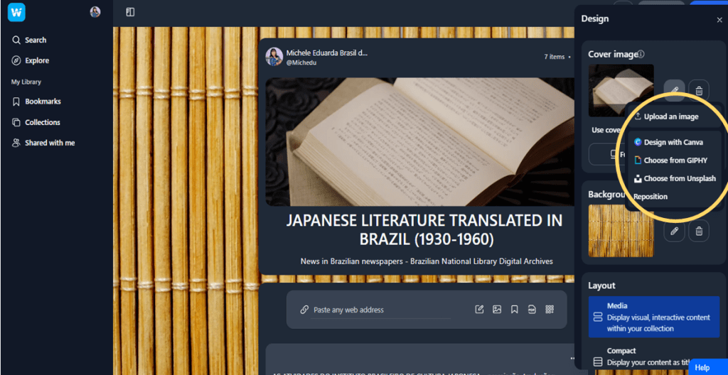 Each collection can also be configured differently. On the “Design” page it is possible to change the collection’s layout and upload cover and background images. If you do not have your own pictures, you have the option of choosing one directly from Giphy or Unsplash or making a new design with Canva.