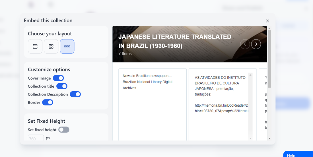 It is also possible to easily embed a collection if you want to display the information on a website, for example. You just need to click on “Share” -> “Publish”. You will see the option “Embed this collection,” where you can customize your options:
